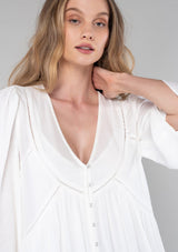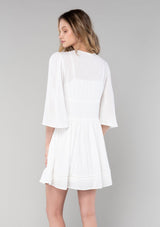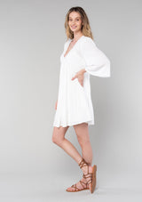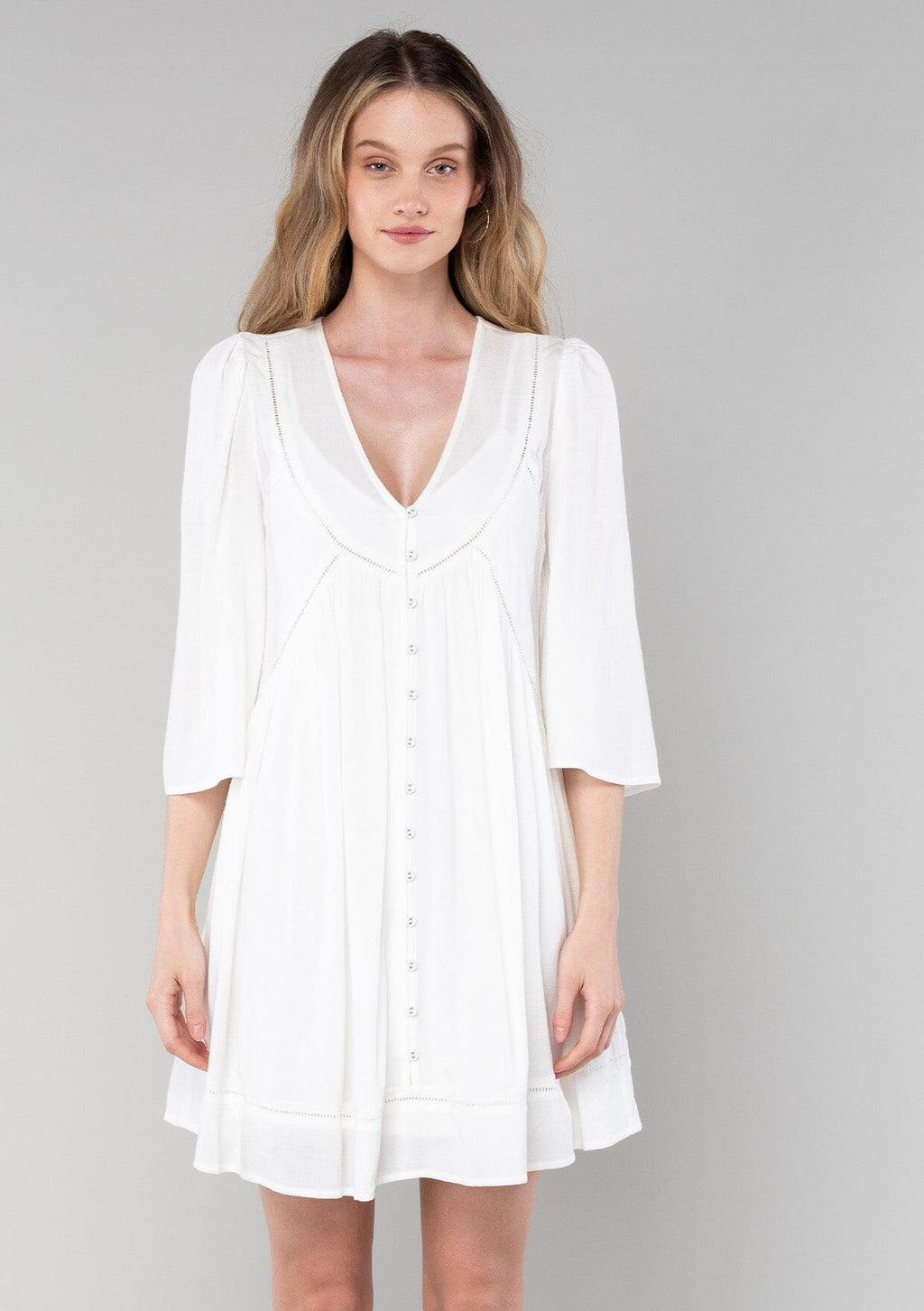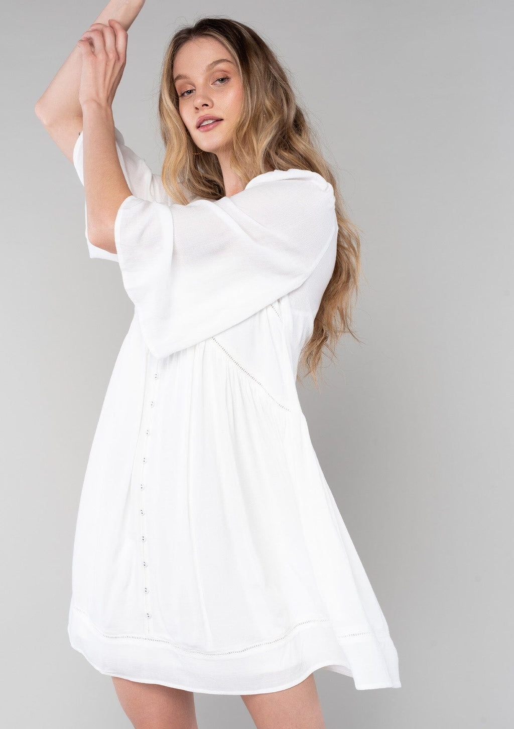 A classic bohemian style for spring and summer, our free and flowy white mini dress features half-length flared sleeves, a delicate self-covered button front, and pretty lattice trim. The perfect day to night style, we love to pair it with a simple flat sandal.