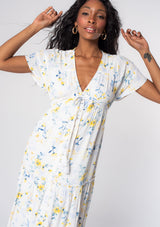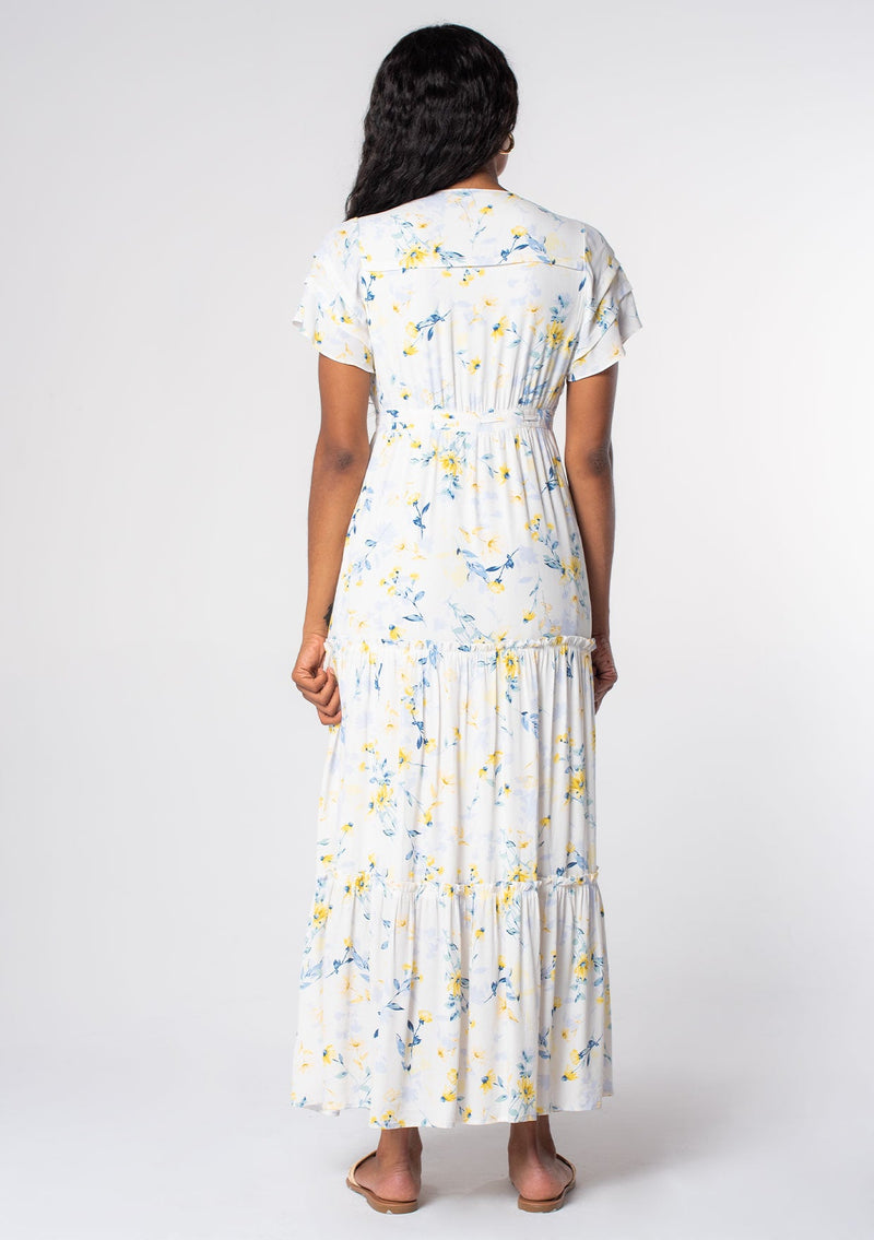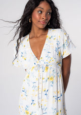 An ultra-romantic bohemian maxi dress that is both flattering and comfortable. Designed in a sunflower print, with short flutter sleeves, a button front, and an empire waist with an adjustable tassel tie drawstring. Dress it up with a heeled sandal for date night, or dress it down with a tennis shoe for a casual everyday look.
