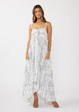 An ultra-flowy maxi dress with a blue & white floral print.