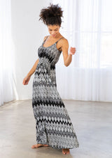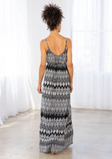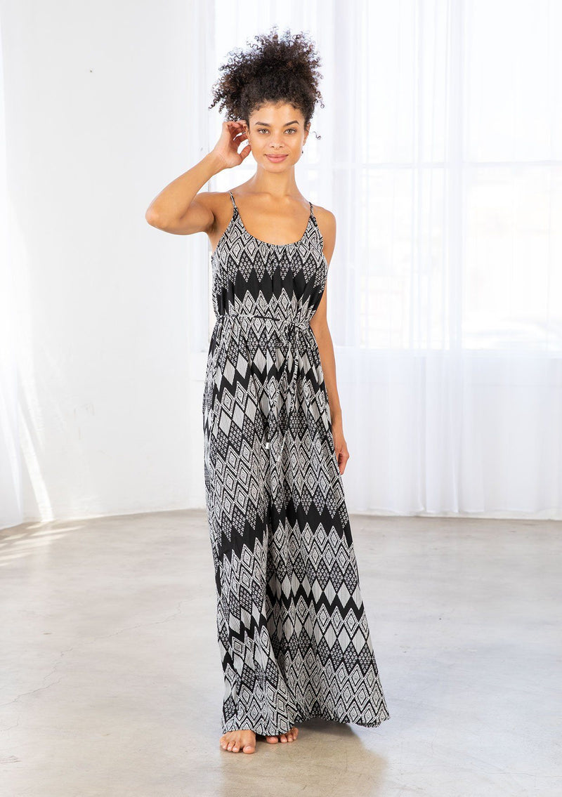 This sleeveless diamond print maxi dress has a flowy design with a tie at the waist. Features a scoop neckline and a loose fit.
