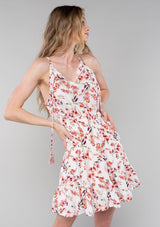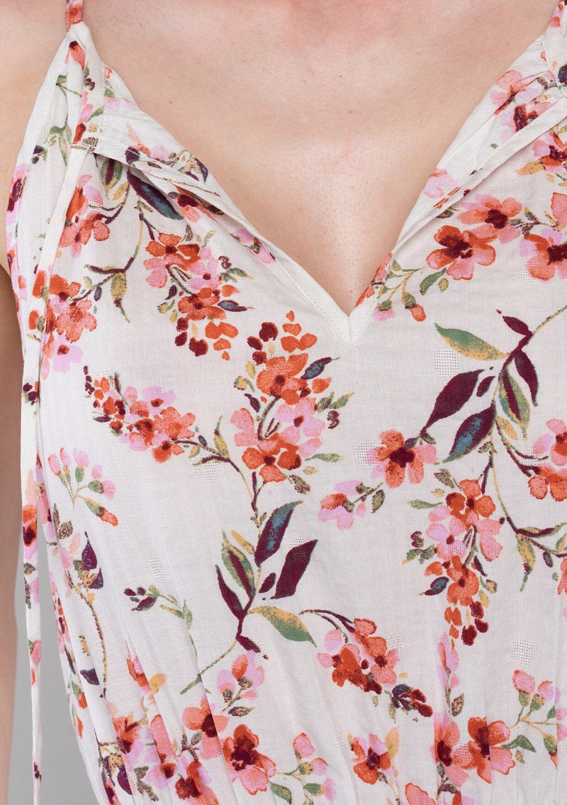 Perfectly sweet and timeless, this classic sleeveless spring mini dress is designed in a floral print. With a flowy tiered skirt, a split v-neckline with tassel ties, and a smocked elastic waist for definition.