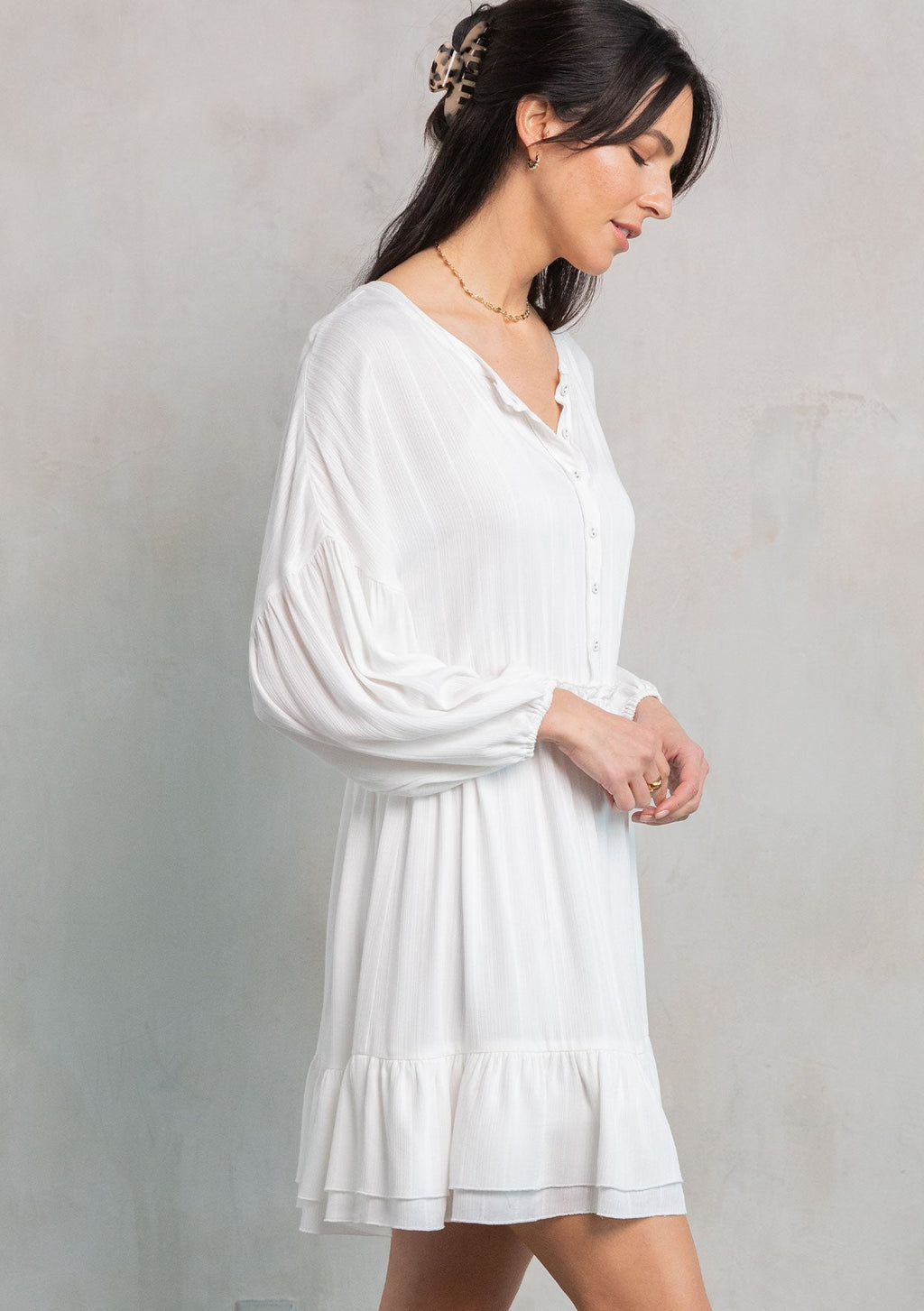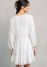 Simple and refined, our ultra-flowy bohemian mini dress is a staple for Spring. Featuring voluminous long sleeves, a delicate self-covered button front, and a double-layered hemline for added shape and movement. This versatile mini dress can be transitioned effortlessly from day to night.