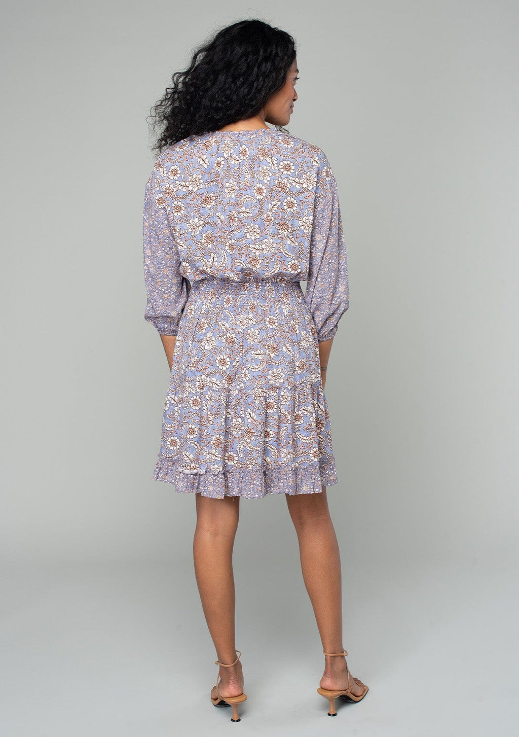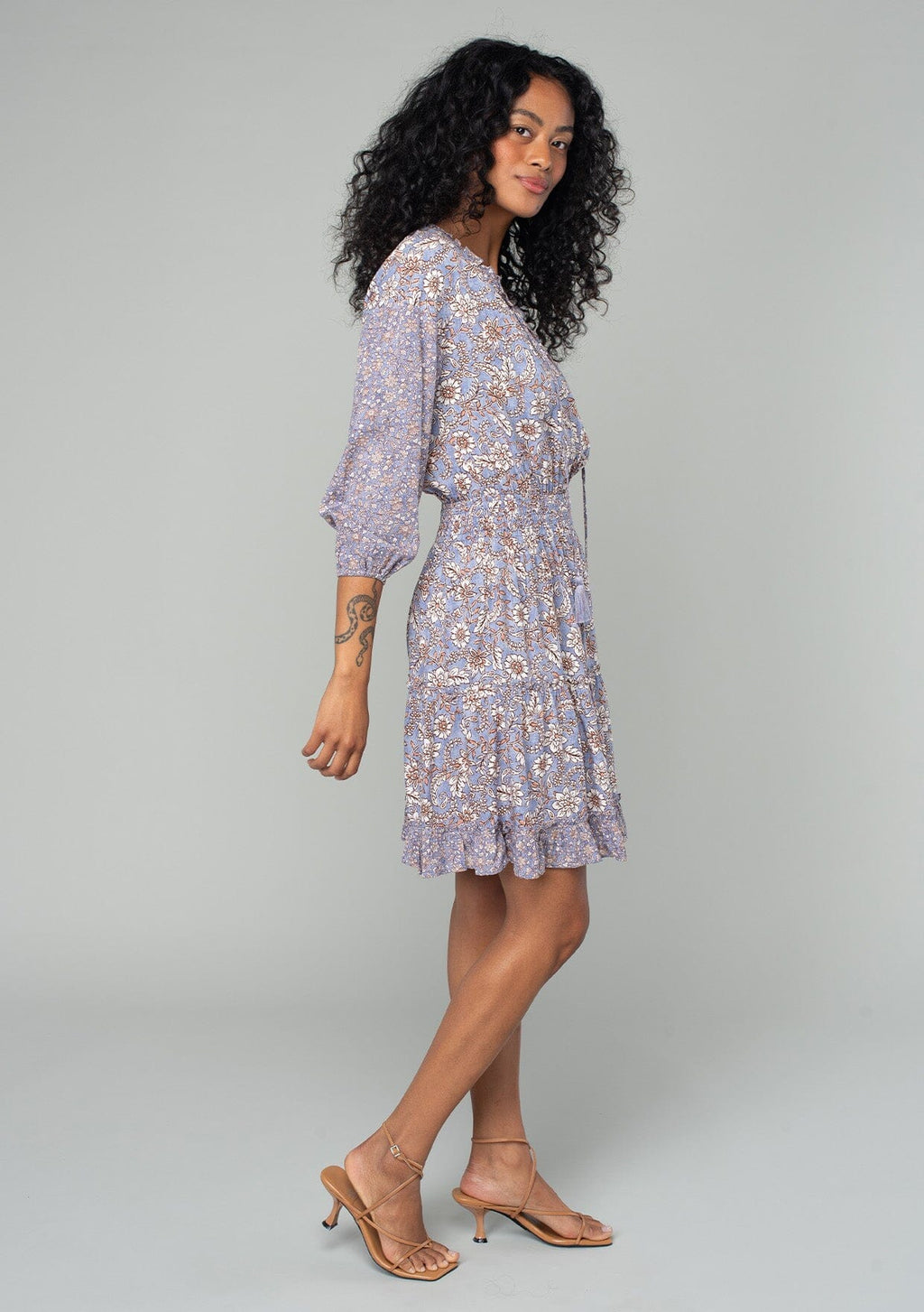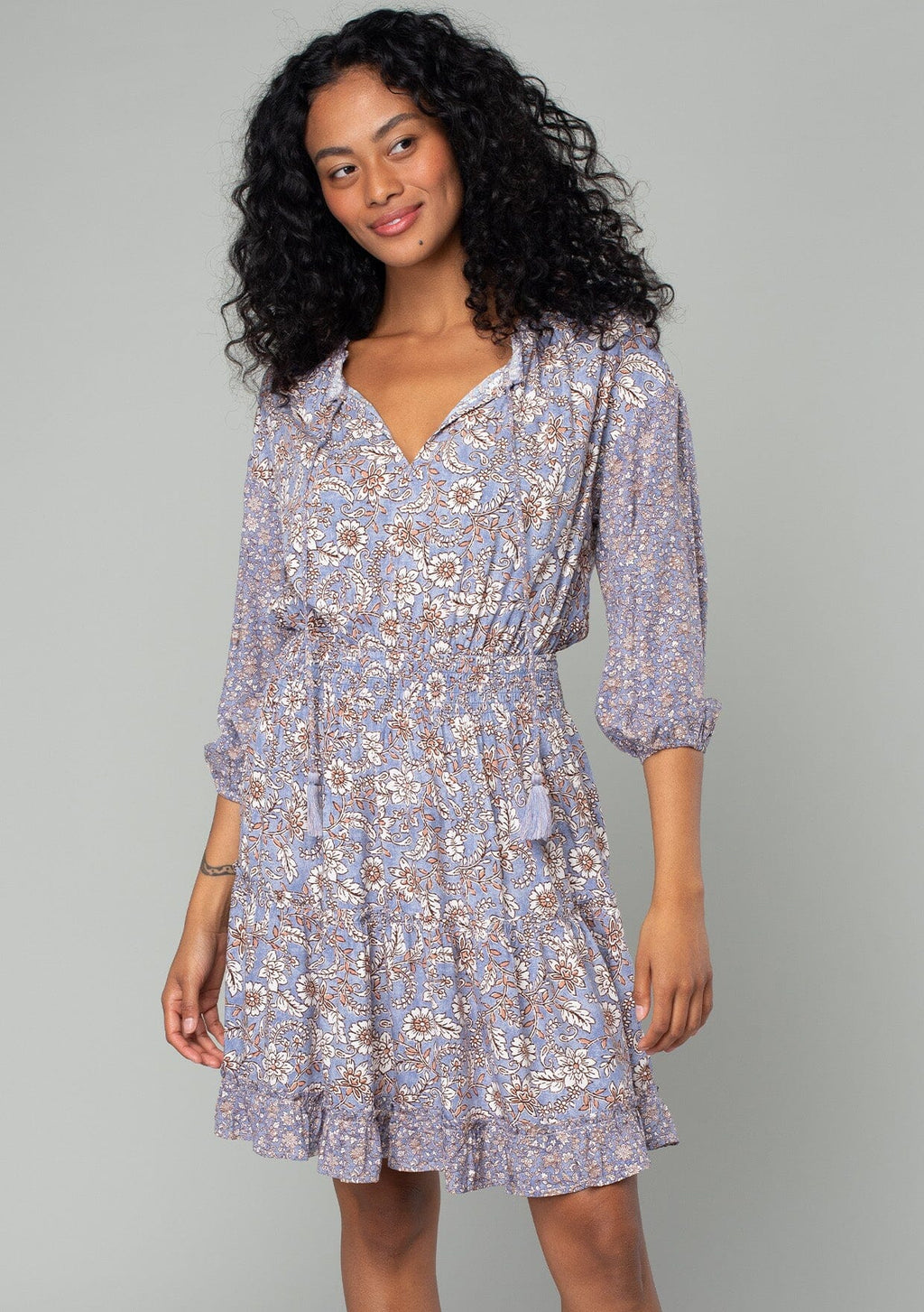 A must-have style for spring, our classic bohemian mini dress is designed in a vintage-inspired mixed floral print. With voluminous 3/4 length sleeves, a flattering split v-neckline with tassel ties, and a flirty ruffle-trimmed tiered skirt.