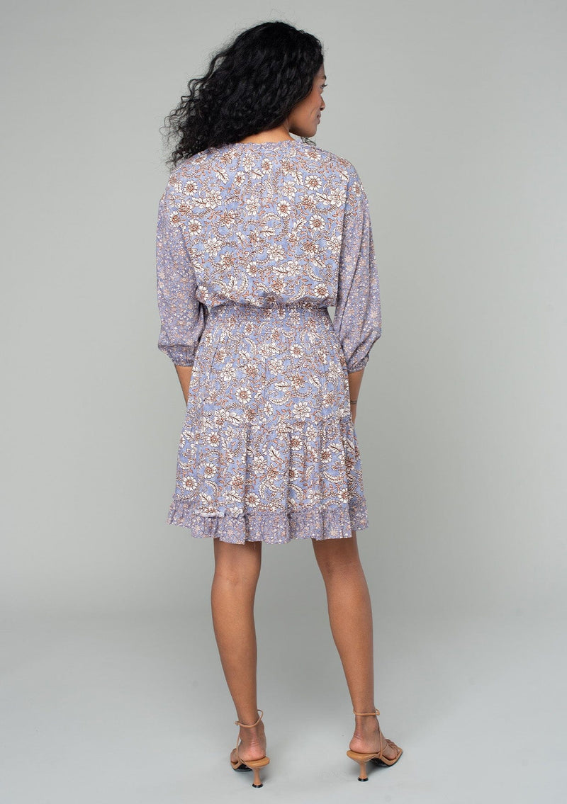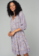 A classic bohemian mini dress in a grey and purple mixed floral print.