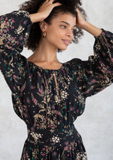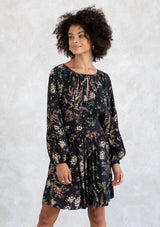A charming autumnal wildflower print elevates this classic bohemian mini dress. Featuring a delicate pleated waist, voluminous long sleeves, and a sexy open back with tassel tie closure. Throw on a strappy sandal for an effortlessly chic look.