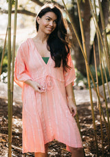 Shop The SaleRemember that part when The Little Mermaid uses a sheet to fashion the perfect beach dress? This is like that but on purpose! This beautiful and super flattering beach dress caftan has oversized 1/3 length kimono sleeves, a sexy deep V-neckline, subtle metallic thread details, and a slimming tassel tie cinch waist. Wear this ultra-bohemian beach caftan as a dress on hot summer days, or throw it on over your bathing suit for a poolside party or beach day. Buy it now and pack it for your next beach vacation!