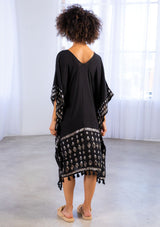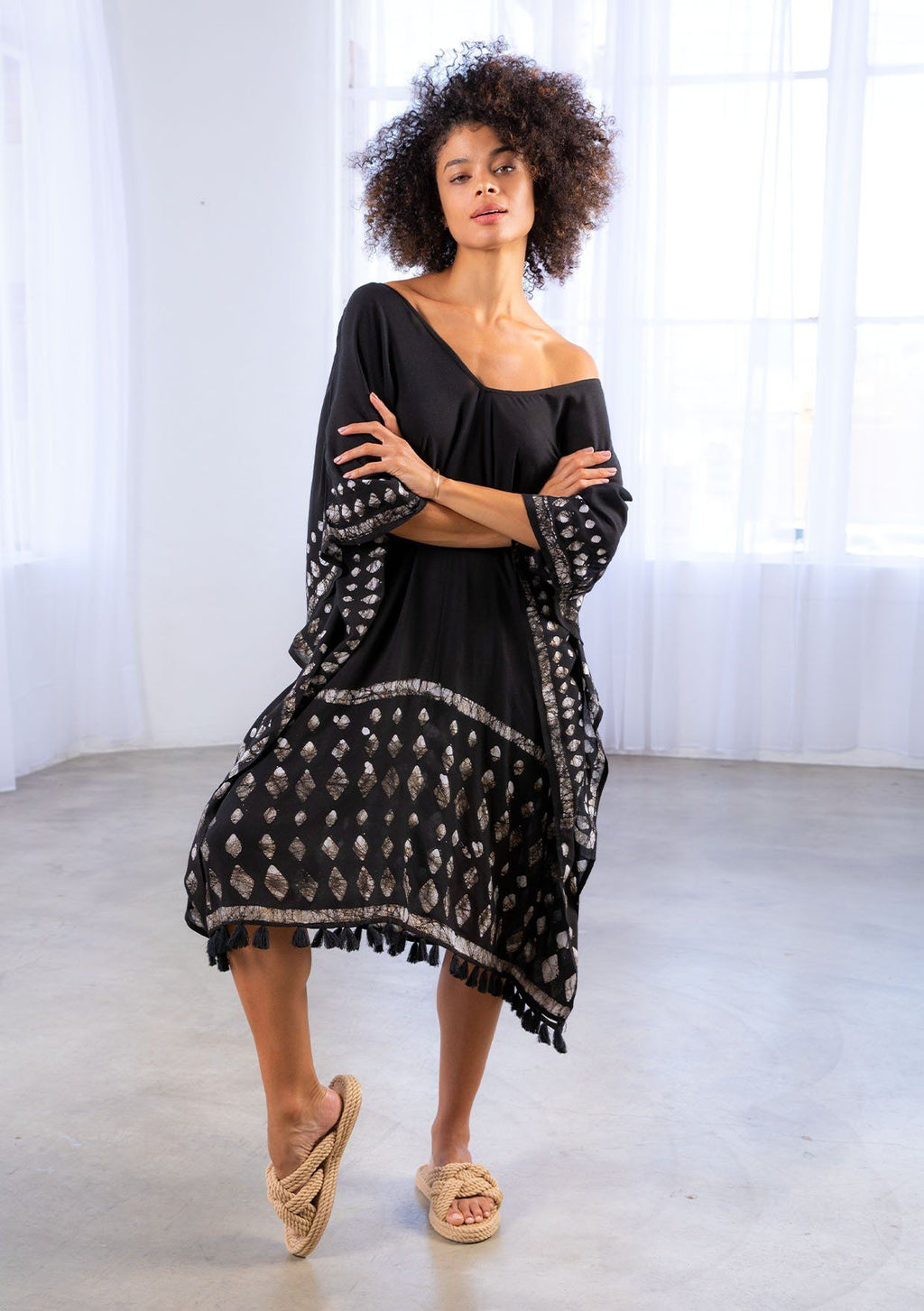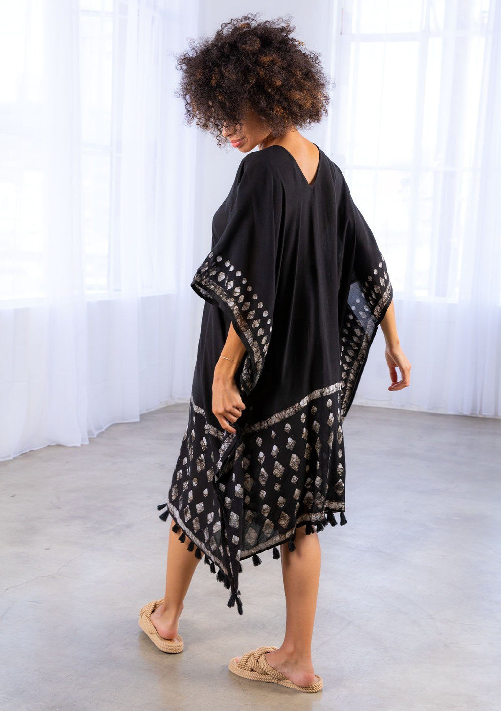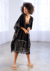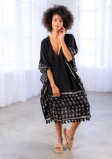 Shop The SaleAdd this versatile bohemian chic caftan to your vacation wardrobe. Featuring a relaxed, oversize fit, bohemian tassel trim, and a gorgeous block print design. Perfect cover up for the beach or as a casual, lightweight dress!