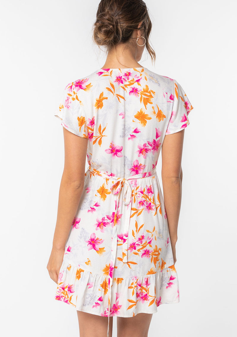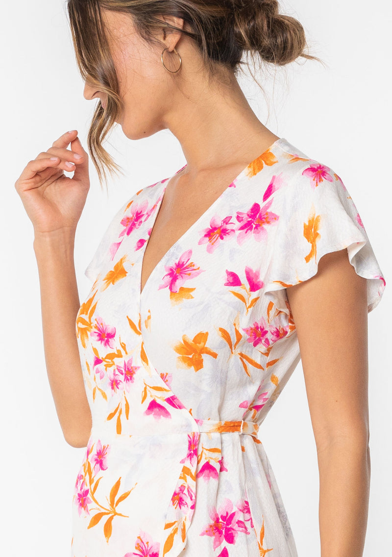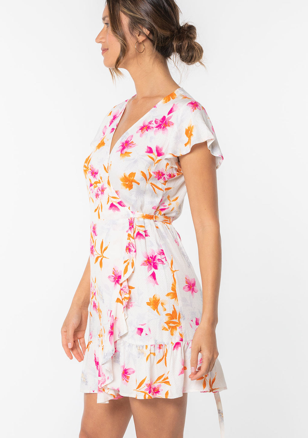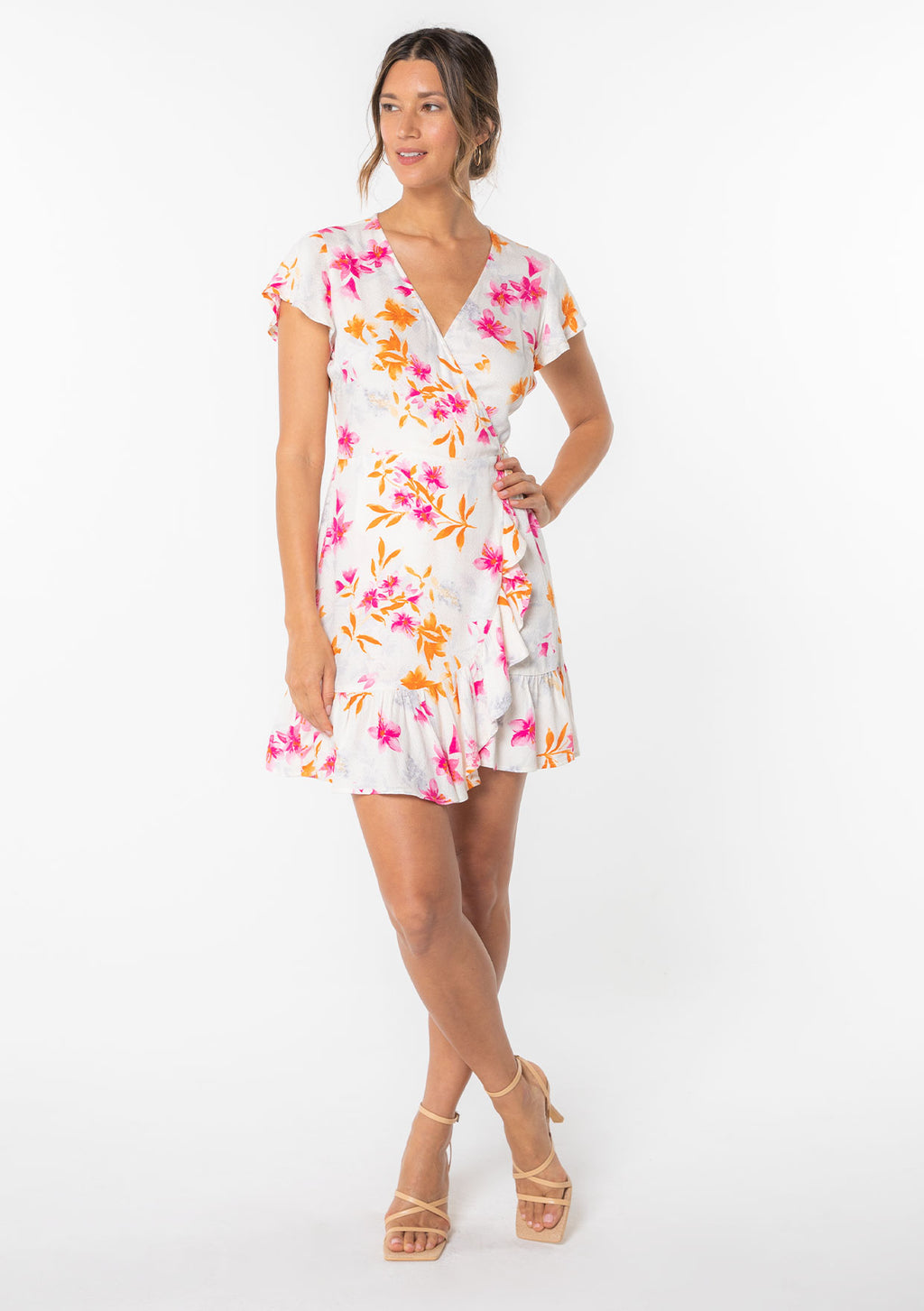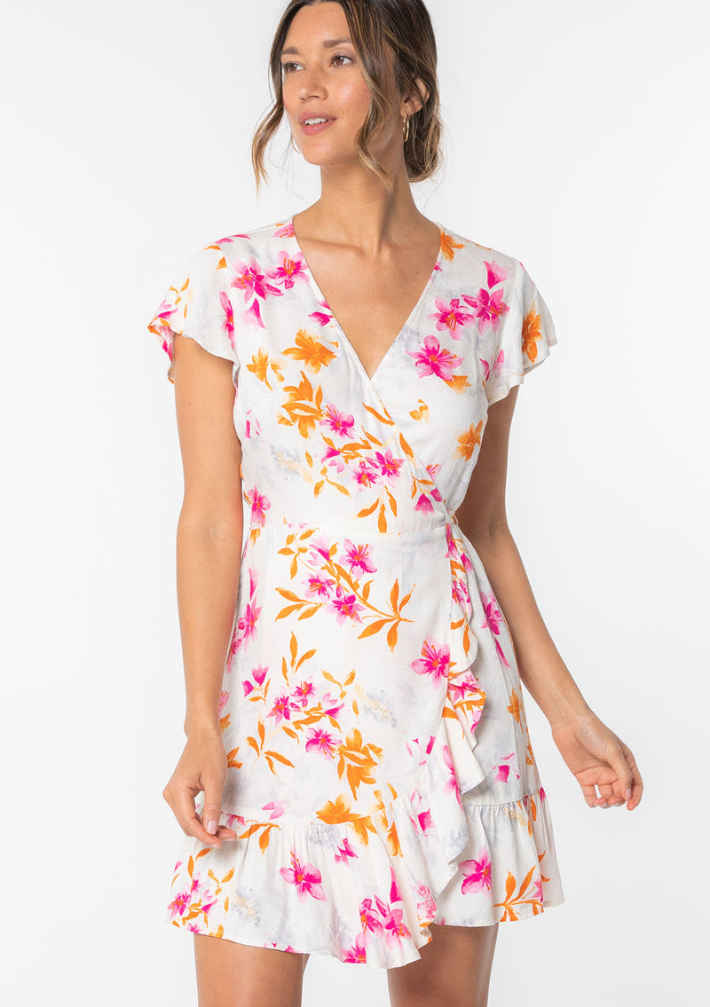 Shop NowAn ultra-flattering mini wrap dress in a delicate floral print. Featuring short flutter sleeves, a flirty ruffled hemline, and a side tie closure. Perfectly pretty for Spring and Summer, we love to style this fit & flare dress with a simple sandal.