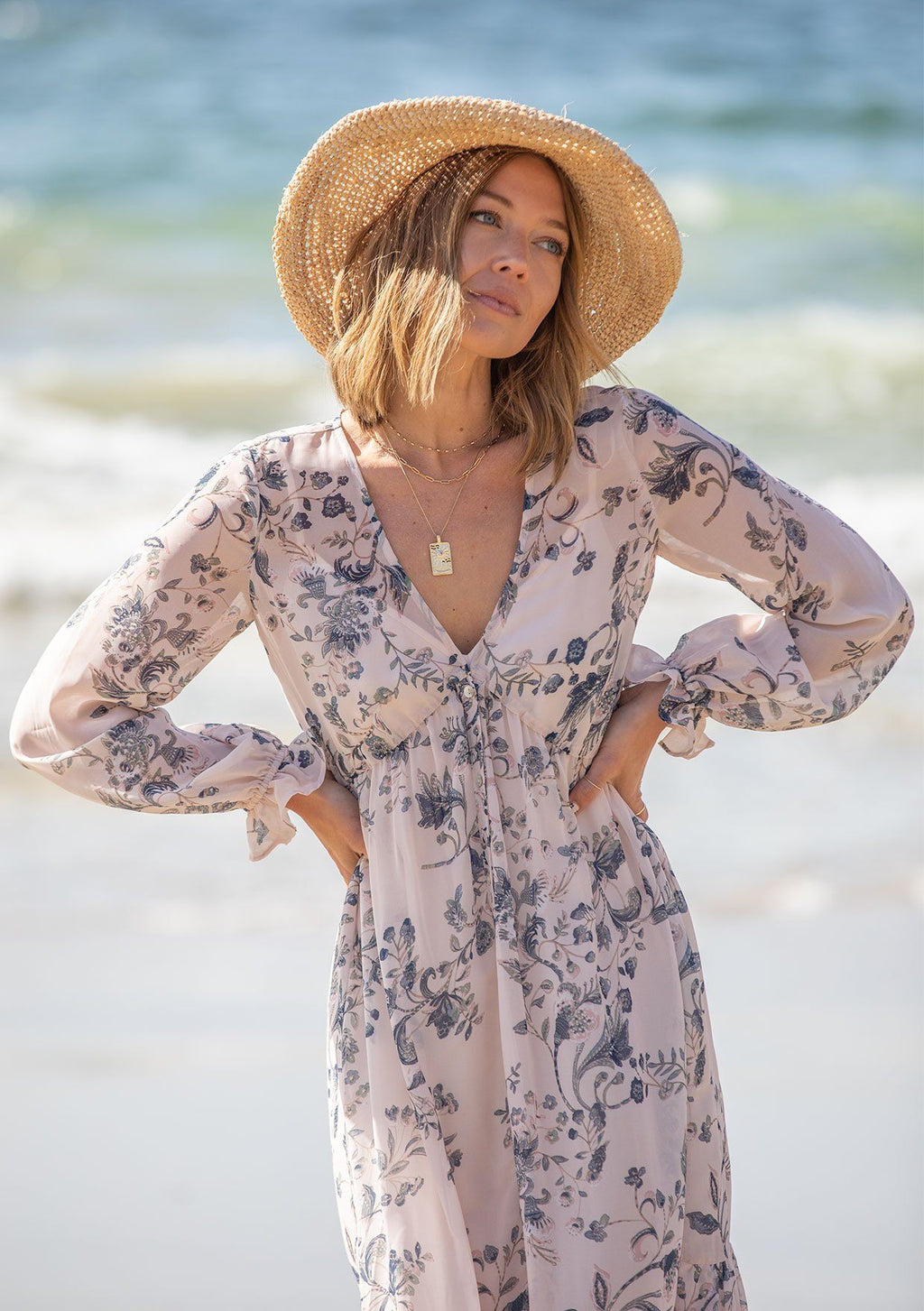 A dress to satisfy all your cottagecore fantasies! Our dreamy sheer chiffon maxi dress is designed in a vintage floral print. Featuring a button-up front, a feminine v-neckline, and sheer voluminous long sleeves with a flounce wrist cuff.