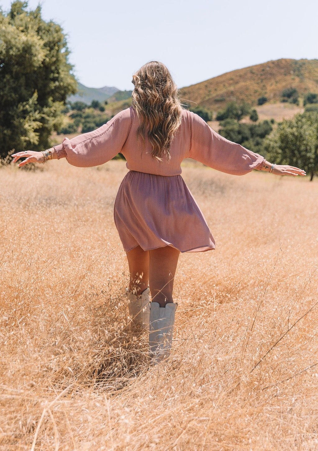 ![[Color: Mauve] A back facing image of a blonde model standing in a field wearing a mauve pink dot print fall mini dress. With voluminous long sleeves, smocked elastic wrist cuffs, a v neckline, a self covered button front, and an elastic waist.](http://www.shoplovestitch.com/cdn/shop/files/I-73046W-SJB-AE_MAUVE_5_160x.jpg?v=1748480432)