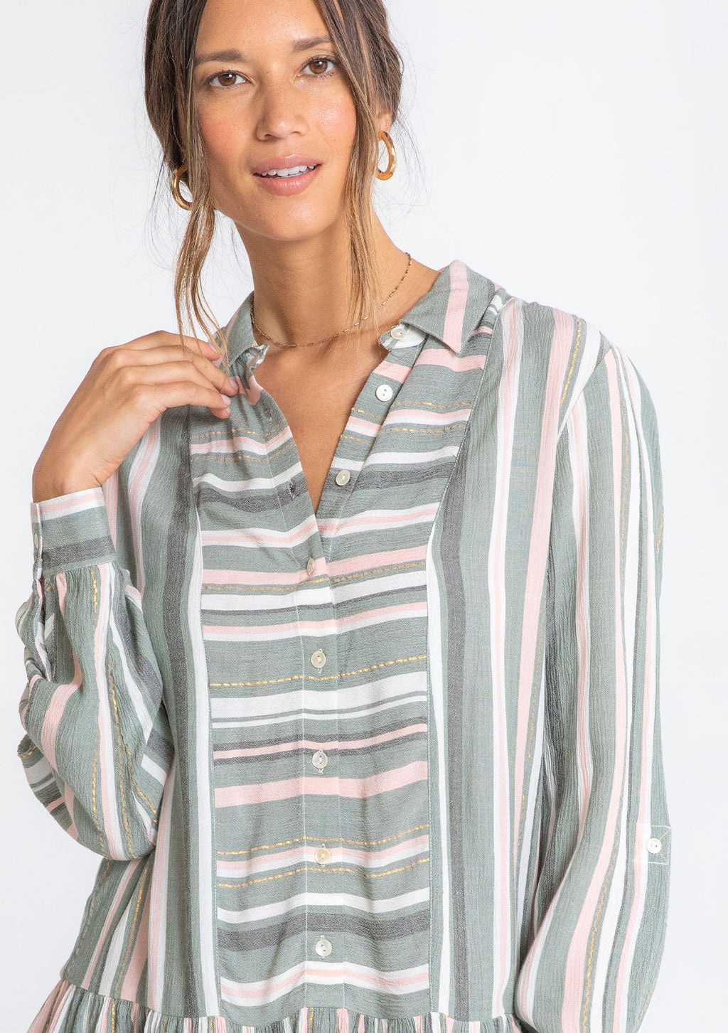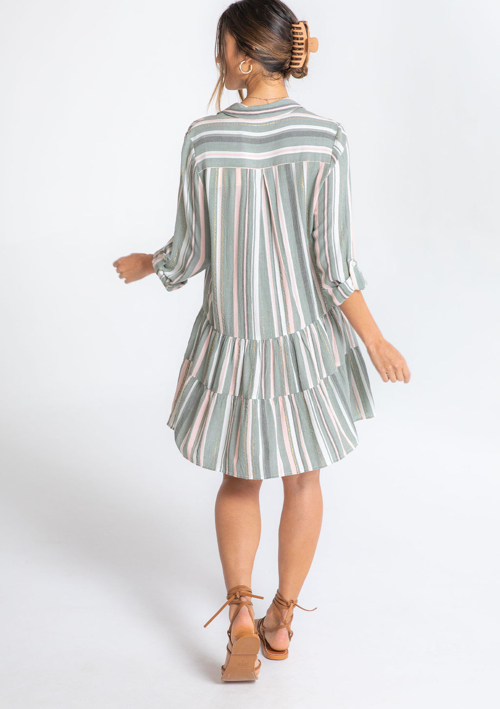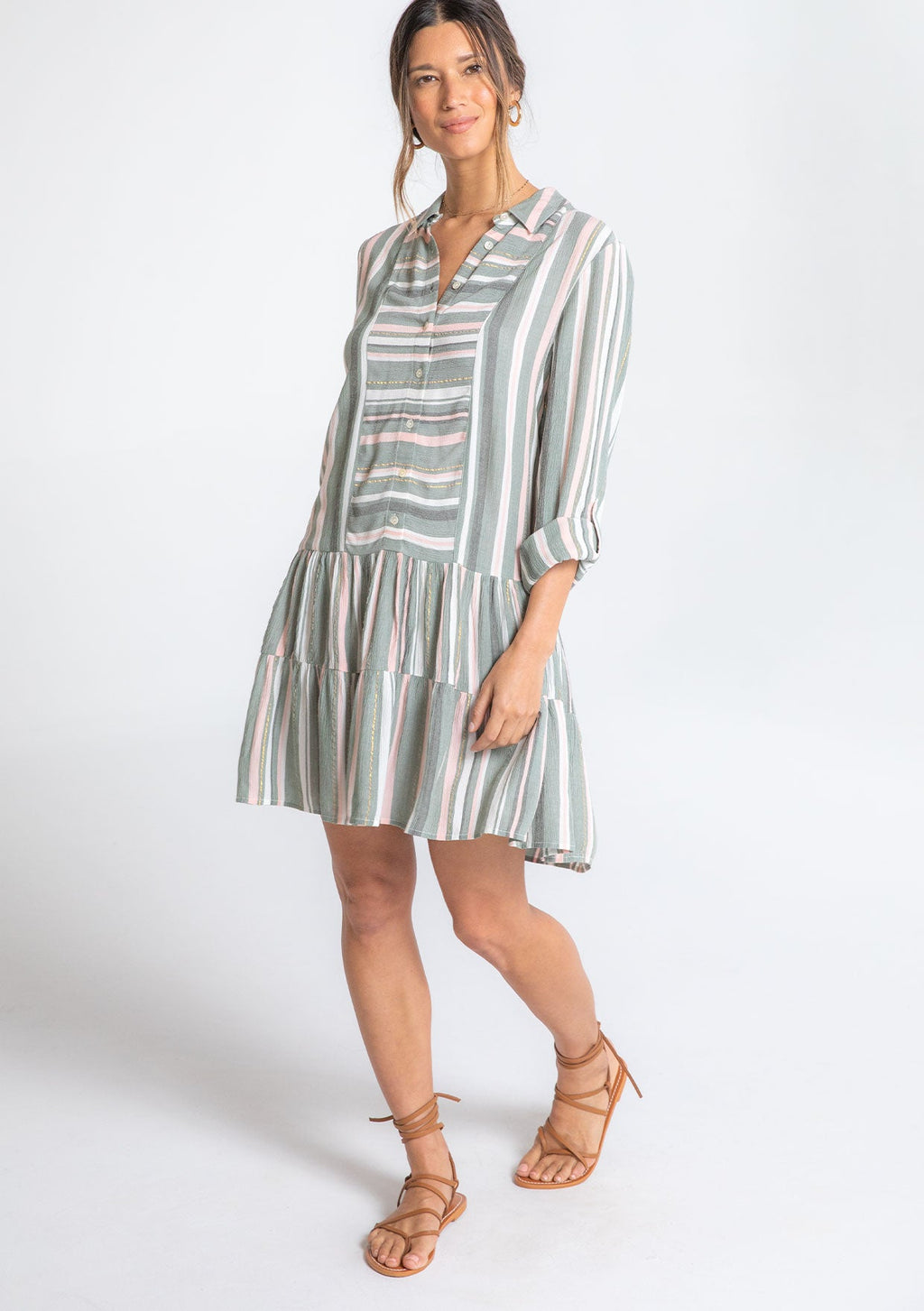 Gold metallic thread details add a light-catching element to this classic mini shirt dress. Designed in an olive green and pink stripe, featuring a long rolled sleeve with button tab closure, a dropped waist, and a button front. The tiered skirt and babydoll dress silhouette add shape and movement to this ultra-flowy style.