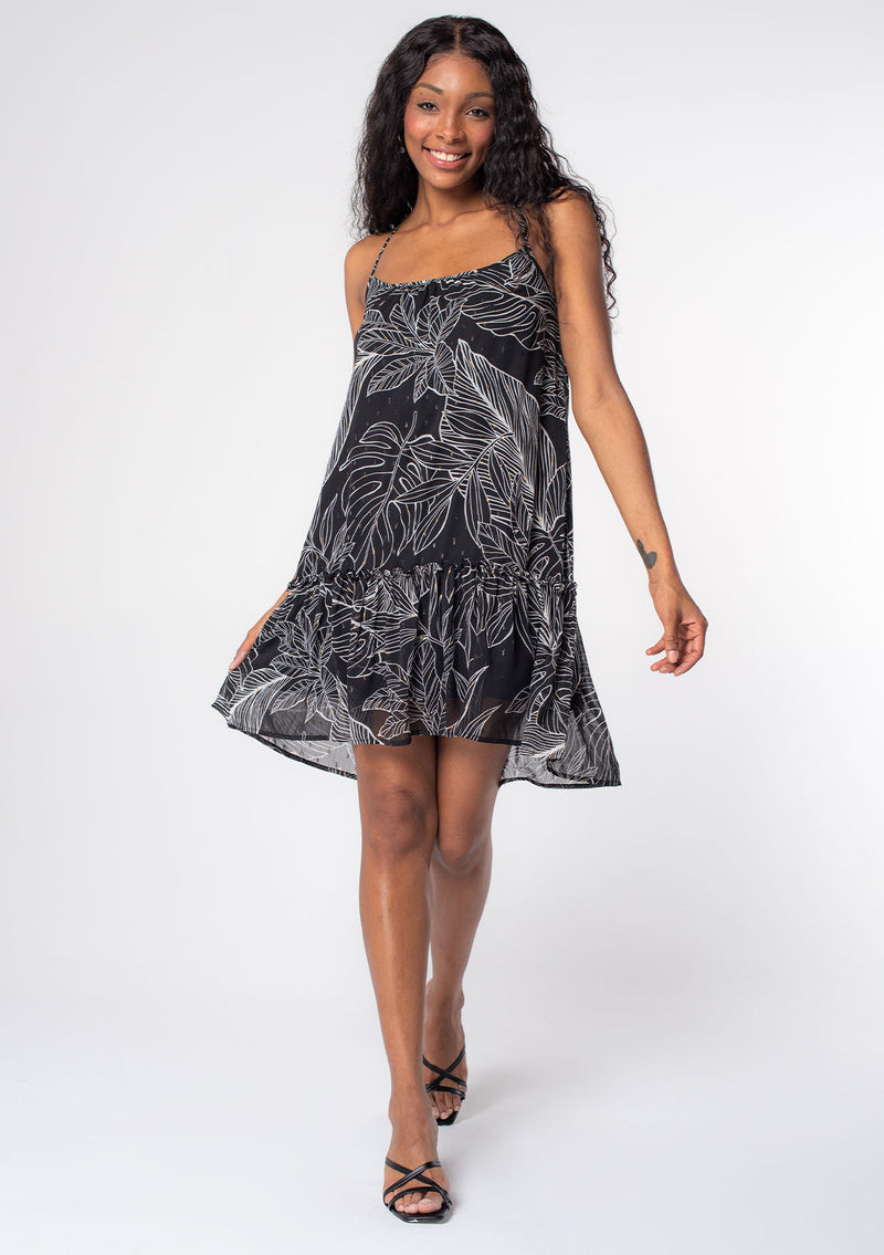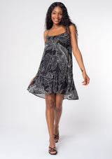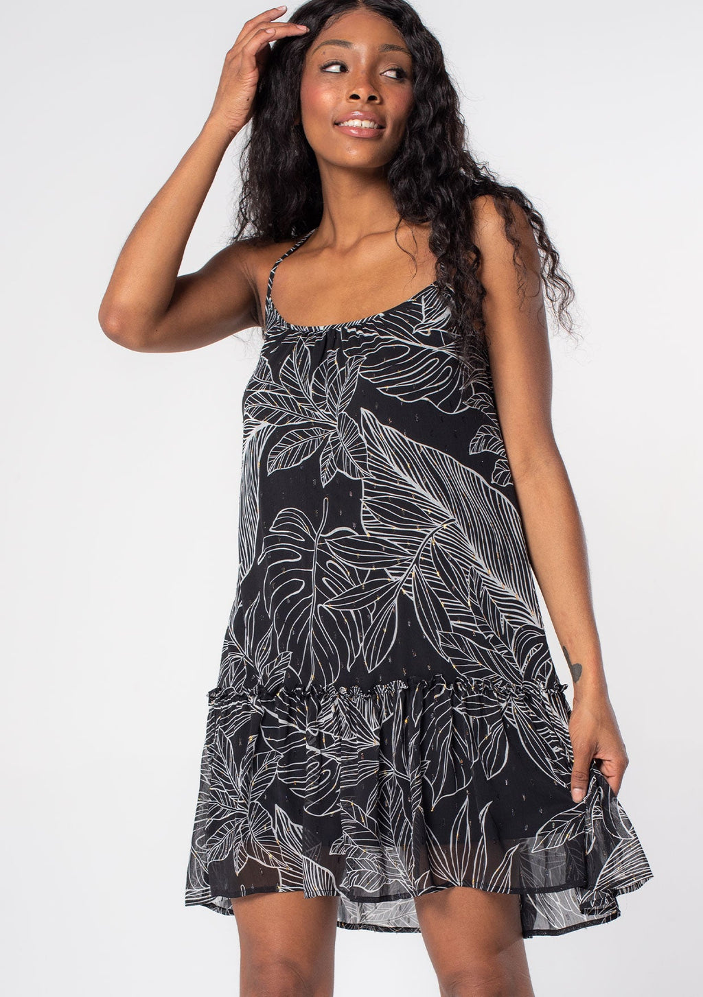 Shop The SaleGold metallic clip dot accents add a festive touch to this dreamy chiffon mini dress. A classic bohemian style with adjustable spaghetti straps that cross in the back, a flowy tiered skirt, and a flattering scooped neckline.