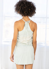 A cute light-wash sleeveless mini dress made from 100% cotton. With side pockets and a racerback with an adjustable tie.