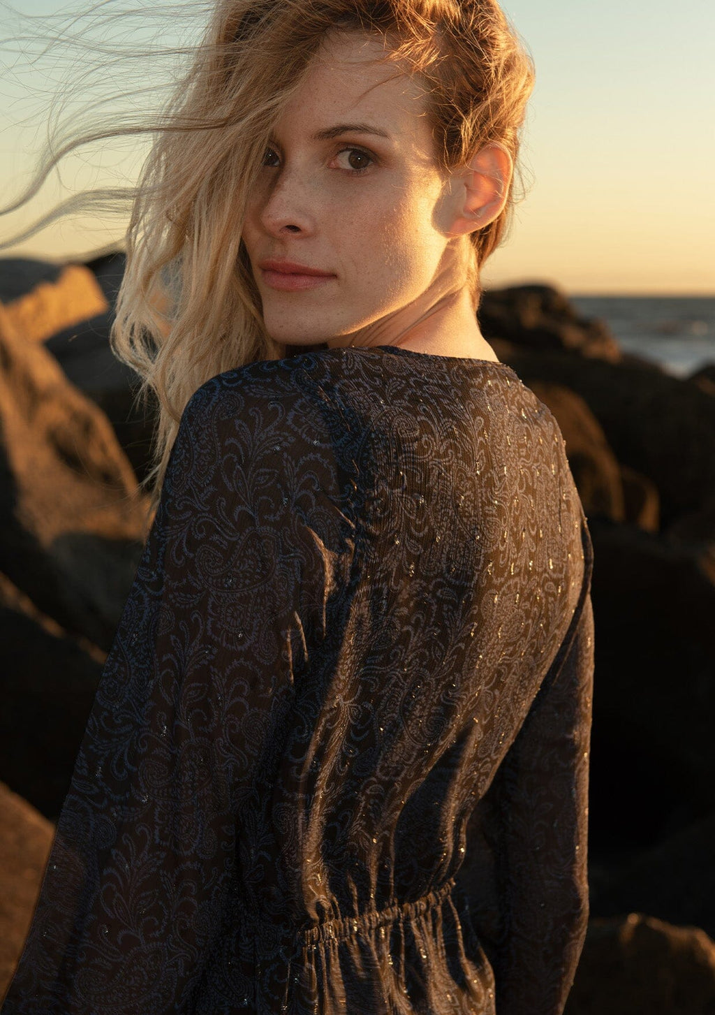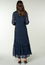 An effortlessly dreamy maxi dress in a blue and black paisley print.