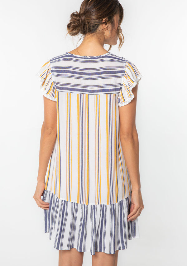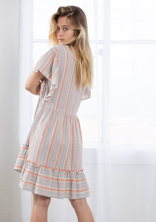 ![[Color: Coral/Navy] A blond model wearing a relaxed, oversize baby doll mini dress in a multi color yarn dye stripe. Featuring short flutter sleeves, a tiered ruffle trimmed skirt, and a plunging v neckline.](http://www.shoplovestitch.com/cdn/shop/products/I-71777W-RLJ-side-back_{width}x.jpg?v=1748475345)