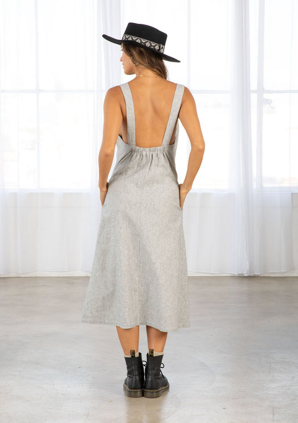 ![[Color: Ivory/Grey] A front facing image of a brunette model wearing an ivory and grey striped sleeveless midi dress with a slim button front bodice, full skirt, smocked back, and side pockets.](http://www.shoplovestitch.com/cdn/shop/files/I-73682WL-TCB-IVORY-GREY-FRONT1_{width}x.jpg?v=1748477567)