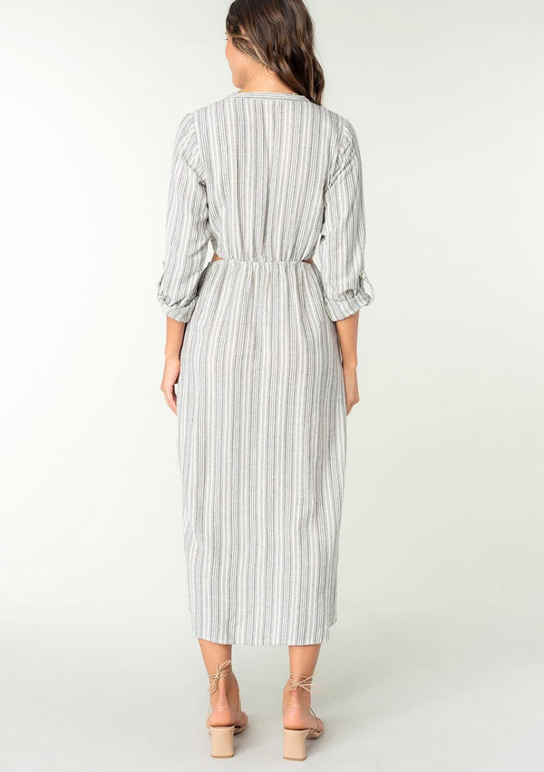 ![[Color: White/Black] A back facing image of a brunette model wearing a striped black and white cotton blend mid length shirt dress. With long rolled sleeves, a button front, a round neckline, side pockets, and sexy side waist cutout details.](http://www.shoplovestitch.com/cdn/shop/products/Lovestitchstripedmaxidresslongsleeveswithsideventdetails_0003_Layer1_{width}x.jpg?v=1748481447)