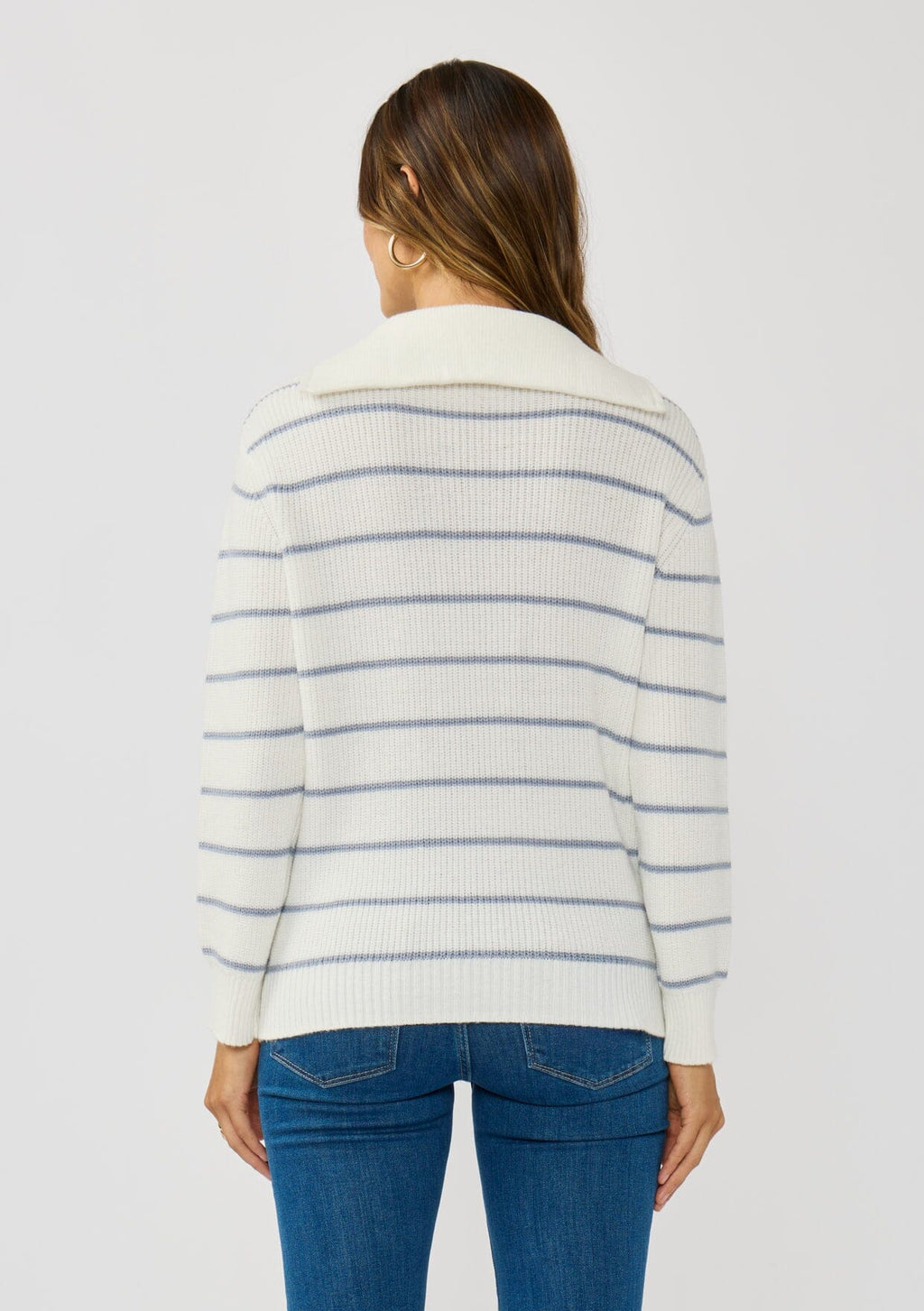 A classic stripe adds a nautical touch to this essential knit sweater. A fresh addition to your transitional wardrobe, this cozy knit sweater features a zip up neckline and a relaxed dropped shoulder. Ideal for breezy days and nights, it’s an effortless everyday piece for any casual outing.