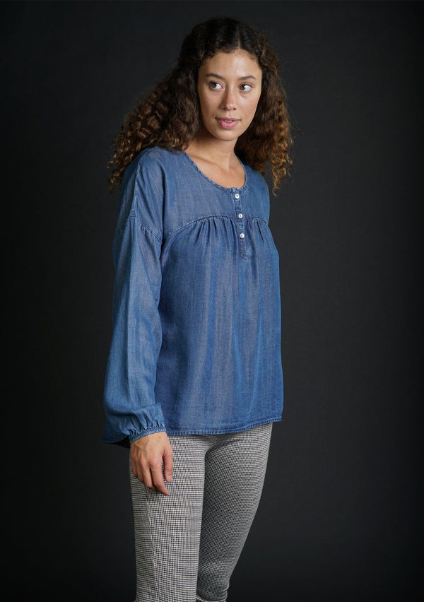 [Color: Vintage Wash] An asian model wearing a tencel blue denim blouse with a button front, yoke, long sleeves with dropped shoulders, and elastic wrist cuffs. [Color: Vintage Wash] An asian model wearing a tencel blue denim blouse with a button front, yoke, long sleeves with dropped shoulders, and elastic wrist cuffs.