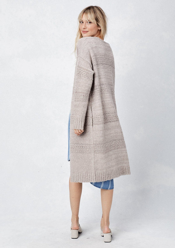 [Color: Grey/Teal/Black]  A front facing image of a brunette model wearing a bohemian striped knit duster cardigan in grey and blue with a shawl collar, side pockets, and a cozy, draped fit perfect for layering over denim.[Color: Grey/Teal/Black]  A front facing image of a brunette model wearing a bohemian striped knit duster cardigan in grey and blue with a shawl collar, side pockets, and a cozy, draped fit perfect for layering over denim.