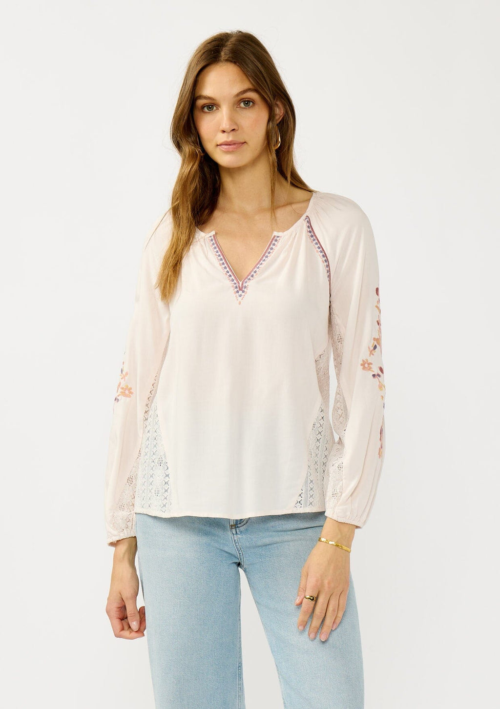 Effortlessly feminine with a laid-back boho vibe, this breezy long sleeve floral top features delicate lace inserts and floral embroidery for a soft, vintage-inspired look. Pair it with denim shorts, relaxed jeans, or a flowy skirt for an easy daytime outfit with a free-spirited feel.
