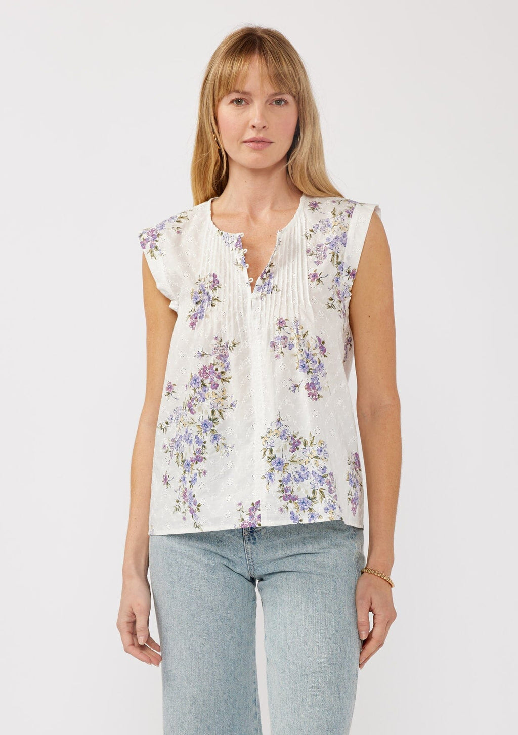 Versatile and effortlessly chic, this spring top features a pretty purple floral print and delicate embroidered eyelet details for a timeless touch. Designed with a relaxed silhouette, cap sleeves, and pintuck accents, it brings a vintage feminine feel to any outfit. Add a romantic touch to any outfit, whether your going for a polished look or laid-back look.