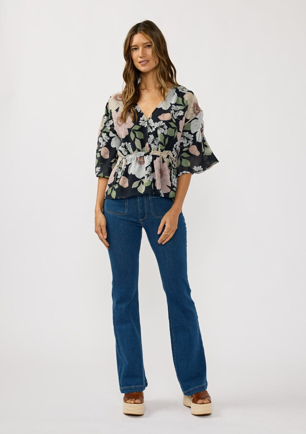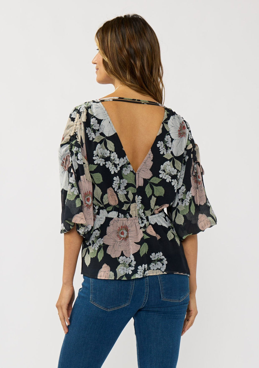 ![[Color: Black/Blush] A back facing image of a brunette model wearing a black and pink floral blouse with a v-neckline, adjustable drawstring waist, and flowy half length sleeves with ruched shoulder detail.](http://www.shoplovestitch.com/cdn/shop/files/LOVESTITCH_20251201_186_160x.jpg?v=1765521355)