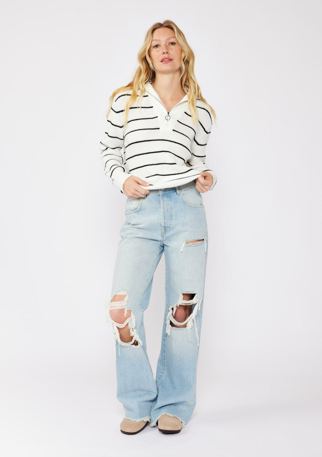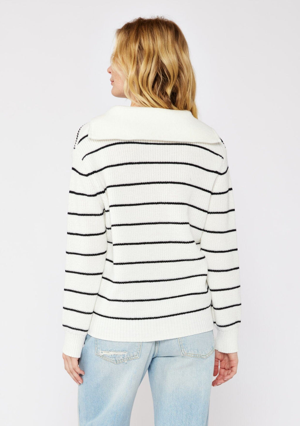 A classic stripe adds a nautical touch to this essential knit sweater. A fresh addition to your transitional wardrobe, this cozy knit sweater features a zip up neckline and a relaxed dropped shoulder. Ideal for breezy days and nights, it’s an effortless everyday piece for any casual outing.
