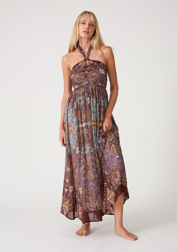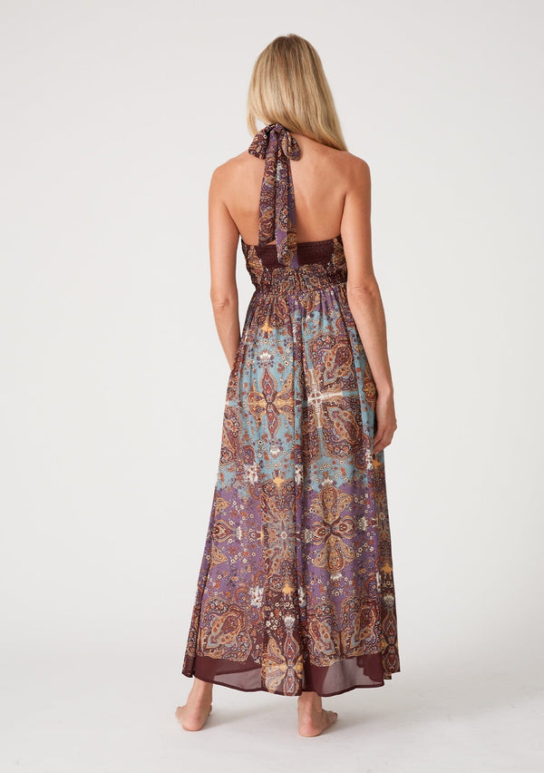 [Color: Raisin/Teal] A full body side facing image of a blonde model standing outside wearing a bohemian halter maxi dress in a multi colored purple and teal floral print. With a tie neckline, a slim fit bodice with a smocked elastic back, and a long flowy skirt.[Color: Raisin/Teal] A full body front facing image of a blonde model standing outside wearing a bohemian halter maxi dress in a multi colored purple and teal floral print. With a tie neckline, a slim fit bodice with a smocked elastic back, and a long flowy skirt.