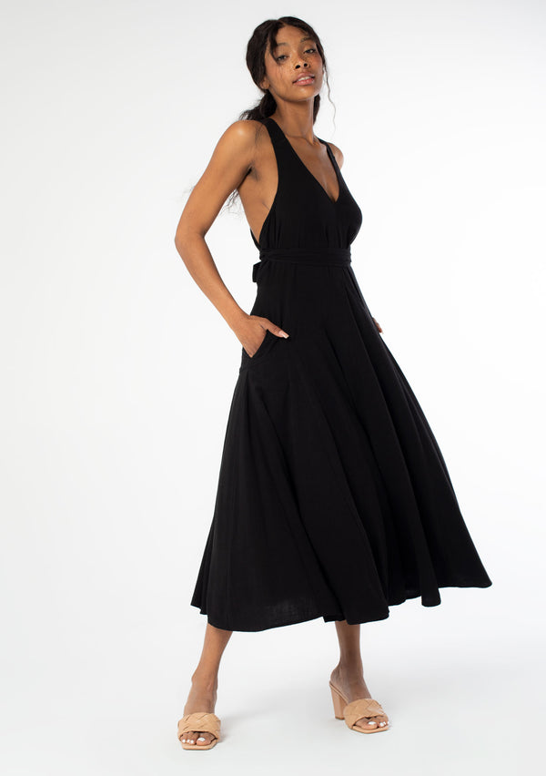 [Color: Black] A close up front facing image of a black model wearing a sleeveless black halter maxi dress. A linen blend tank dress with a sexy open back, cross back racer back straps, side pockets, and a back button detail. [Color: Black] A front facing image of a black model wearing a sleeveless black halter maxi dress. A linen blend tank dress with a sexy open back, cross back racer back straps, side pockets, and a back button detail.