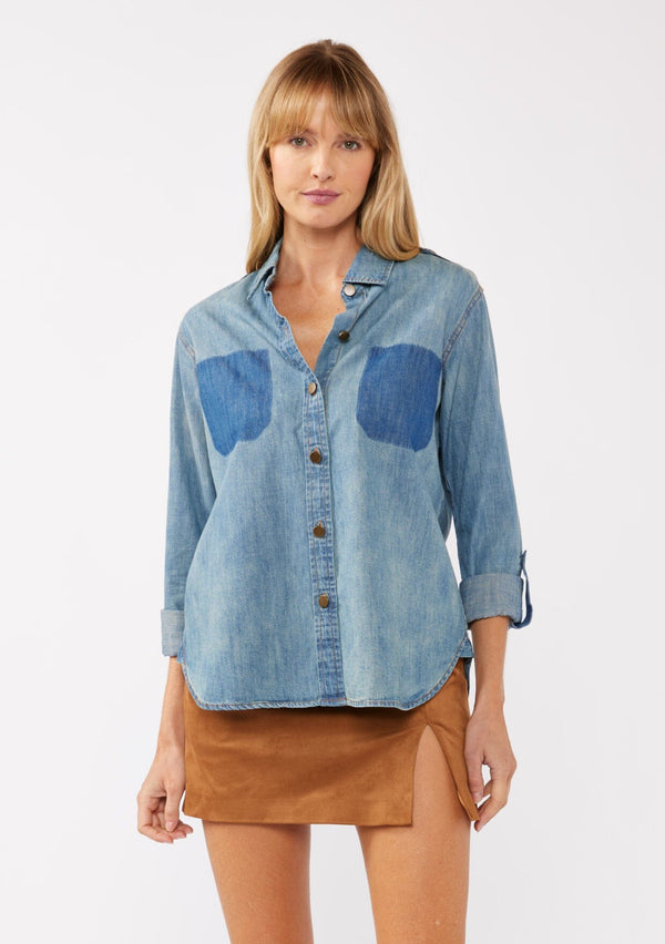 ![[Color: Indigo] A front facing image of a blonde model wearing a two-tone cotton button-down shirt in denim indigo. The blouse features a collared neckline, faux pockets, and roll-tab sleeves, offering a western-inspired style perfect for fall looks.](http://www.shoplovestitch.com/cdn/shop/files/092024_178_{width}x.jpg?v=1727982824)