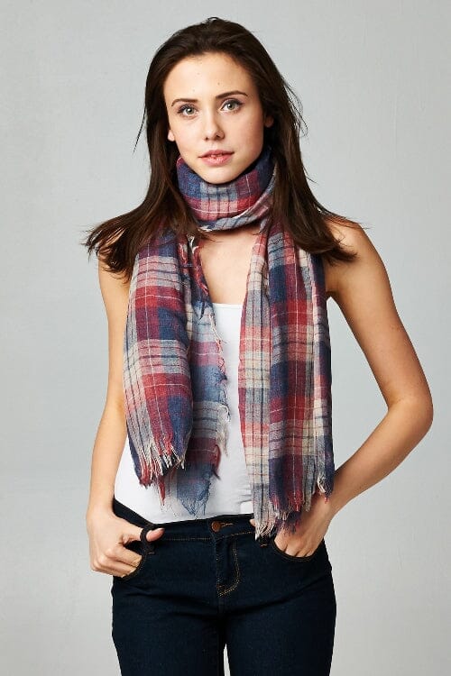 [Color: Orange/Seafoam/Beige] A brunette model wearing an orange and seafoam green plaid scarf with a fringed trim detail at the ends. Perfect for cozy layering and fall styling. [Color: Orange/Seafoam/Beige] A brunette model wearing an orange and seafoam green plaid scarf with a fringed trim detail at the ends. Perfect for cozy layering and fall styling.