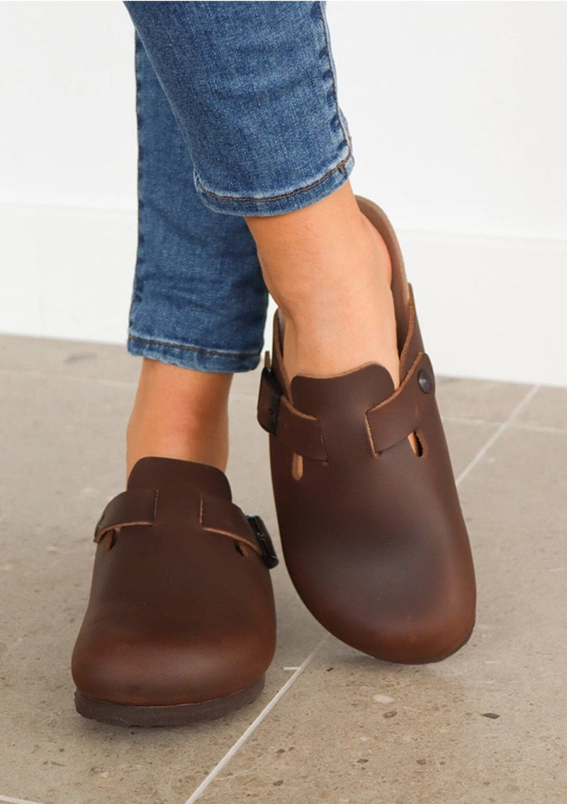 Step into a vintage vibe with these unisex GENUINS clogs in camel leather. With an adjustable buckle and an anatomical footbed made of cork and foam, they offer timeless style and supreme comfort.
