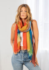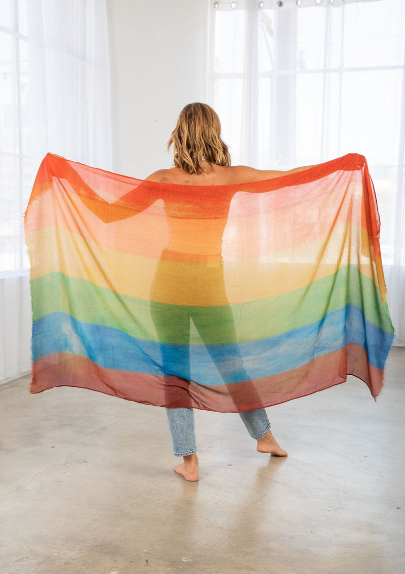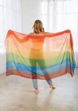 Wear this stunning lightweight rainbow scarf with pride! A sheer printed mesh style with cool raw unfinished edges. A great accessory for year-round!