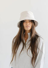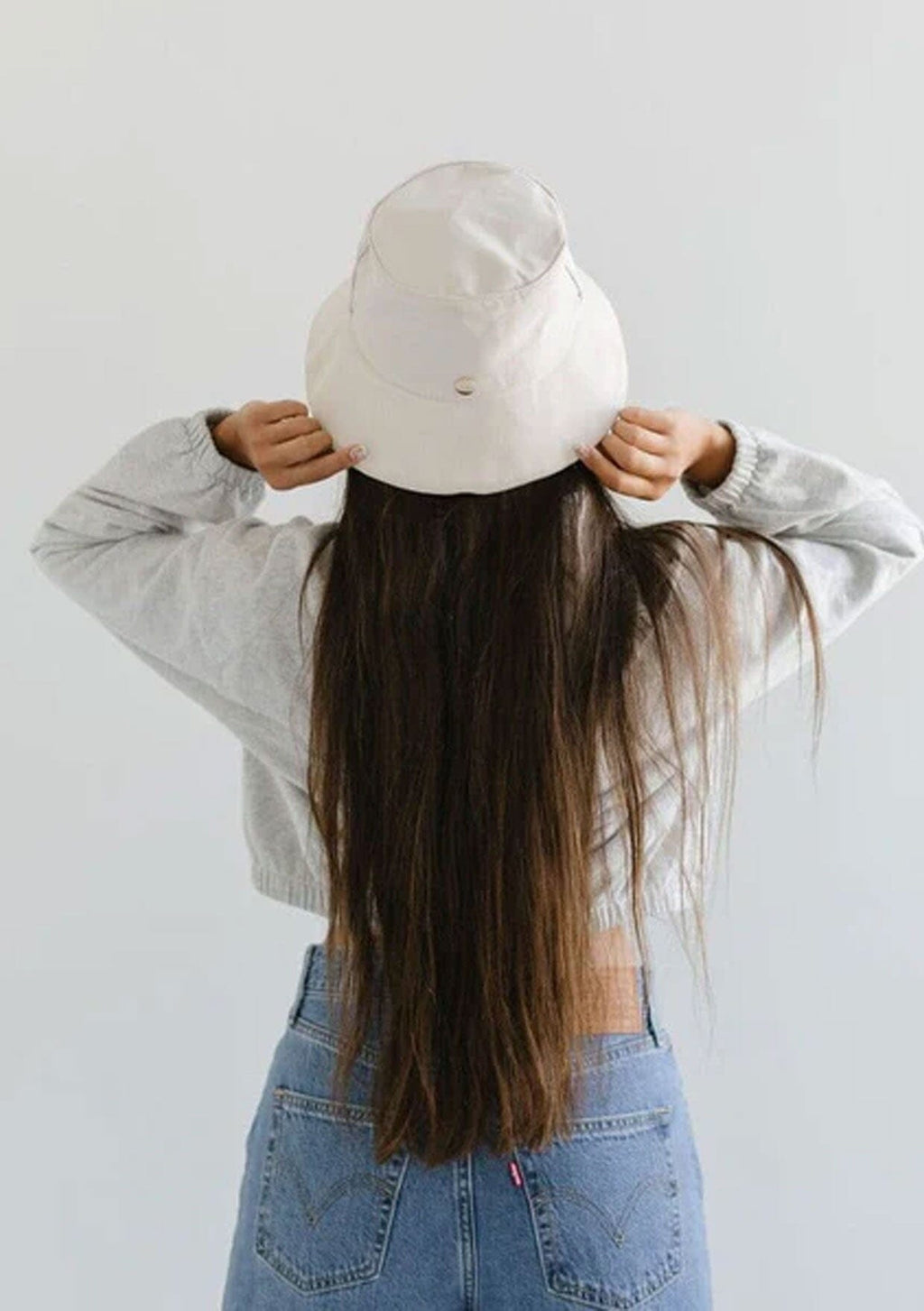 Gigi Pip's first-ever bucket hat features a satin liner and adjustable inner band. The hat also features piping details and a gold GP pin on the back of the crown.