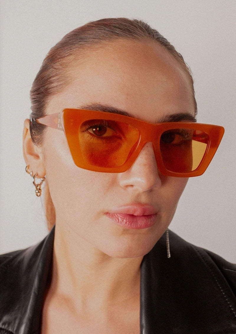 Styled in a sleek orange frame with soft amber lenses, these sunglasses are destined to become a statement piece in your accessory collection. Crafted with optical-grade stainless steel hardware and wire cores, this design exudes both quality and luxury. The ultimate grab-and-go accessory for a timeless, everyday look.