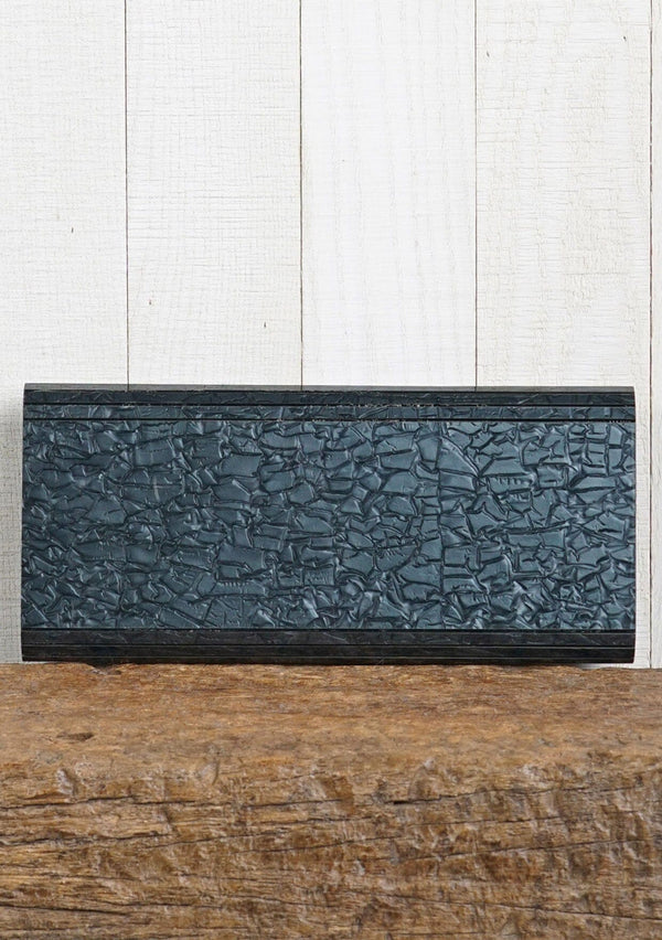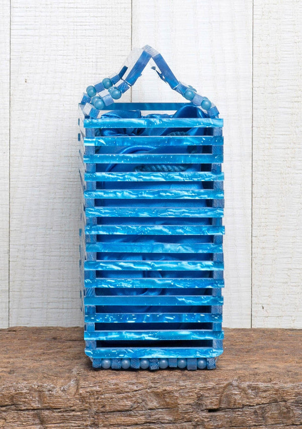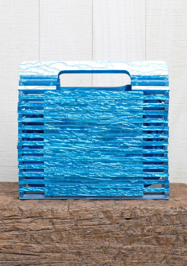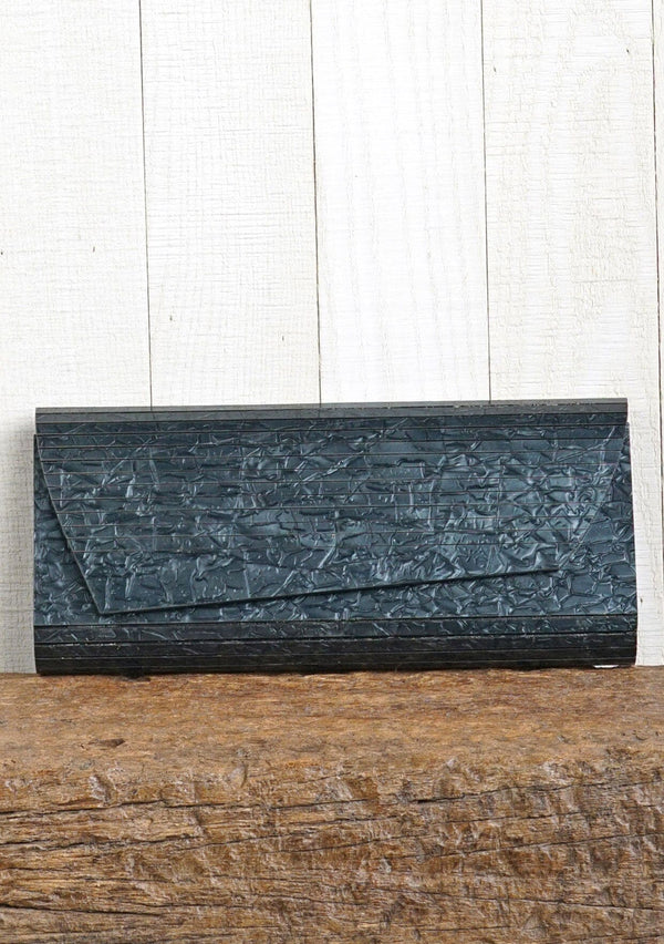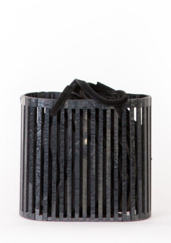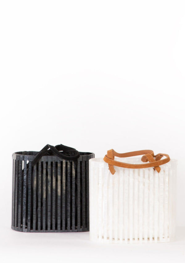 [Color: Nero] A black collapsible leather tote with short handles and a triangular or square silhouette. [Color: Black] A black collapsible leather toe with short handles and a triangular or square silhouette.