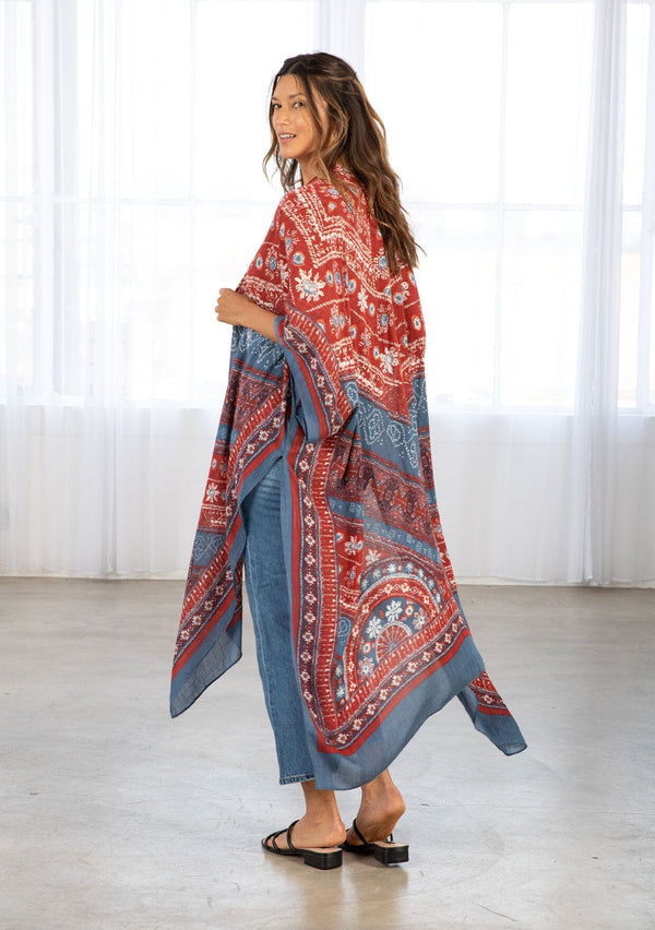 [Color: Blue/Brick] A model wearing a red and blue bohemian mid length kimono. Featuring half length kimono sleeves, side slits, an open front, and a multi colored bohemian pattern throughout.[Color: Blue/Brick] A model wearing a red and blue bohemian mid length kimono. Featuring half length kimono sleeves, side slits, an open front, and a multi colored bohemian pattern throughout.