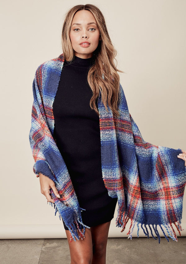 [Color: Blue Multi] a brunette model wearing a red and blue brushed boucle plaid scarf with a fringed trim. Perfect for cozy fall and winter days. [Color: Blue Multi] a brunette model wearing a red and blue brushed boucle plaid scarf with a fringed trim. Perfect for cozy fall and winter days.