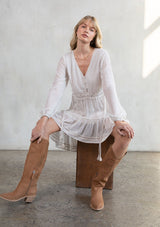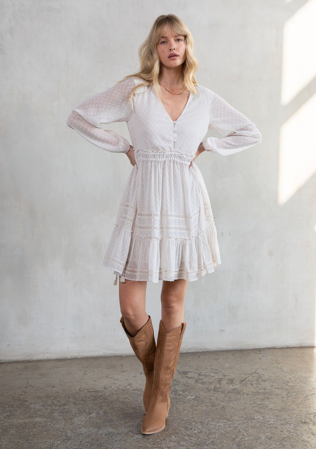A dress worth celebrating! Our holiday-ready sheer swiss dot mini dress features long voluminous sleeves, a delicate loop button front top, and a pretty lace-trimmed skirt. The ruffle-trimmed drawstring waist can be adjusted for a waist-defining or loose and flowy look.