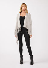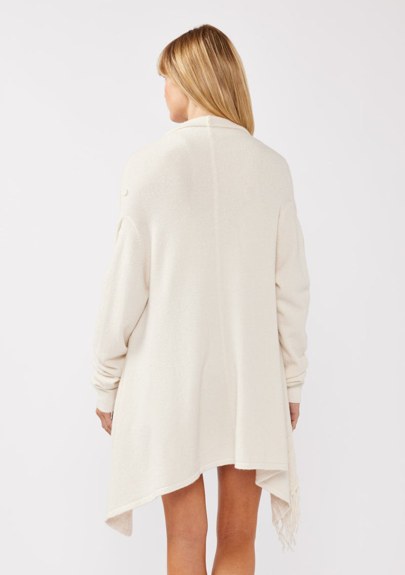 Our best-selling fringed sweater is back with a super soft, fresh new look. The versatile design and chic asymmetrical hem make it the perfect year-round piece, ready to elevate any occasion. Keep it open as a cozy cardigan for an effortless vibe, or button it up for a sleek look.