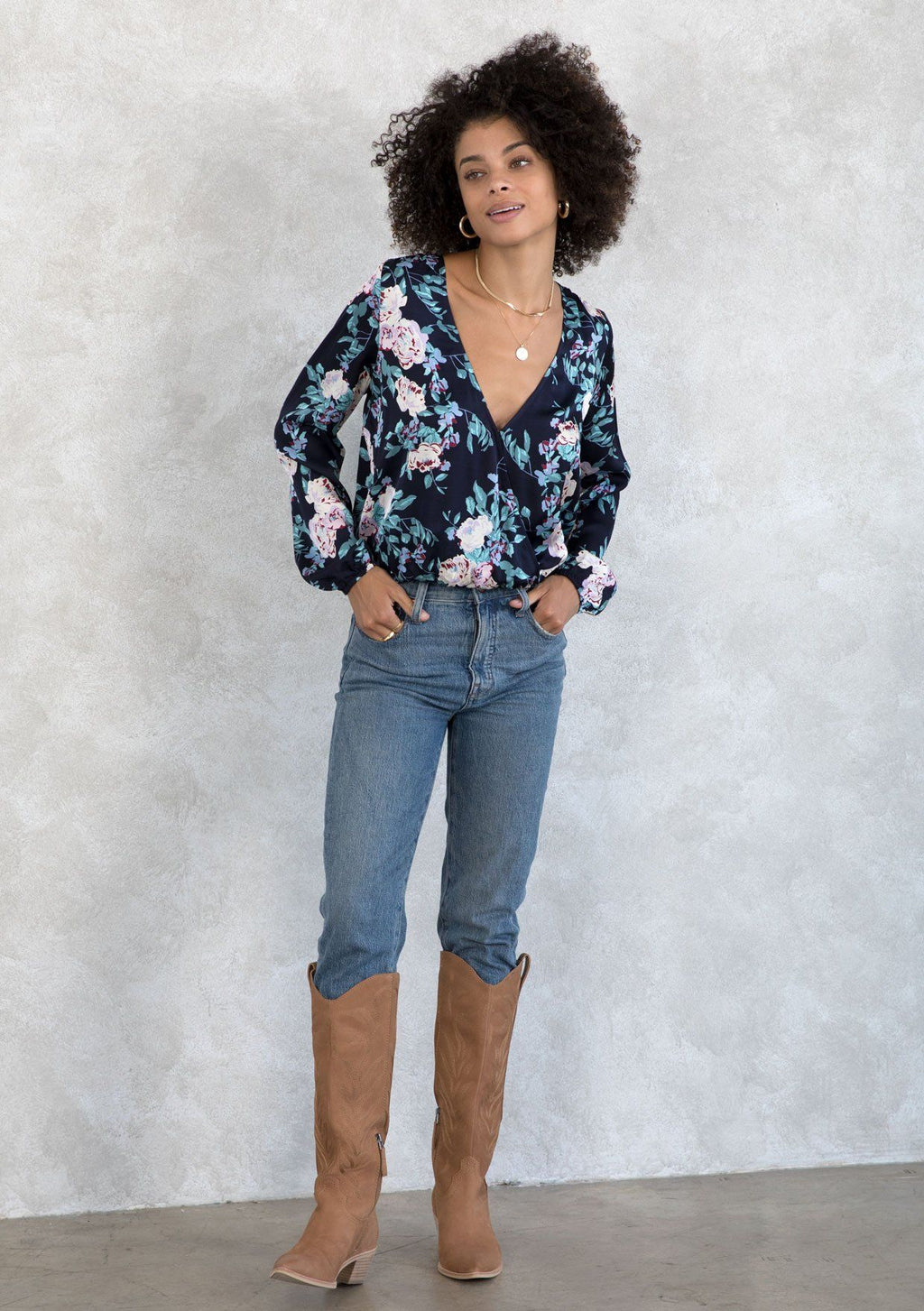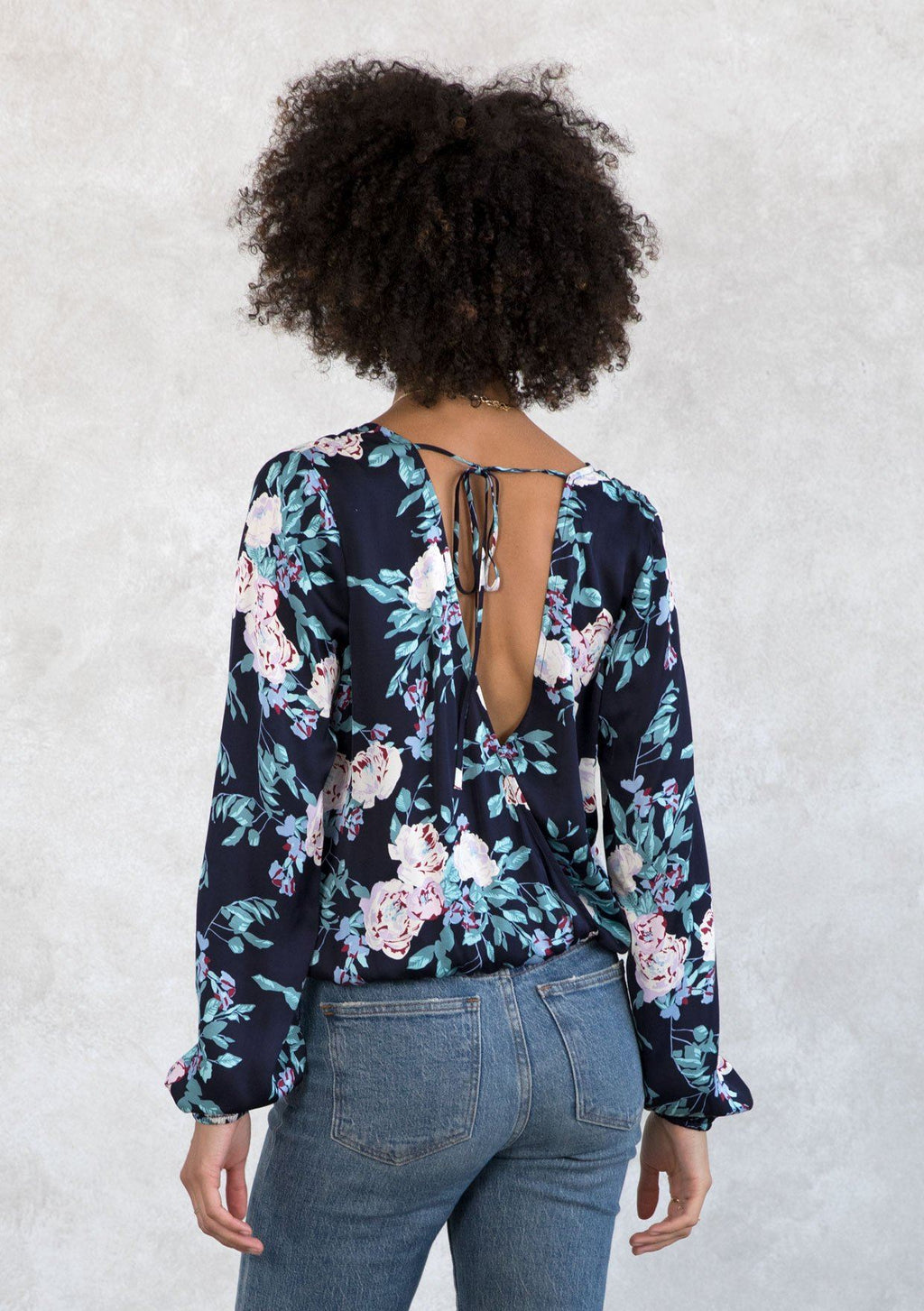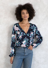 ![[Color: Navy/Lilac] A model wearing a navy and lilac floral print silky blouse. With a surplice neckline in the front and back, a smocked elastic hemline, and long voluminous sleeves.](http://www.shoplovestitch.com/cdn/shop/products/I-13718W-ROM-BS_NAVY-LILAC-.JPG_0bce17bf-46fd-4ac4-aa6c-e0d73ffb6848_160x.jpg?v=1748483270)