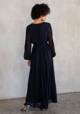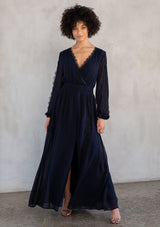 A special occasion requires a special dress. Designed in ethereal chiffon, this ultra-romantic maxi dress features a smocked elastic waist for definition, a flattering surplice neckline, and a sexy front slit. Contrast lace trim details add an elegant touch to this Holiday party-ready style.