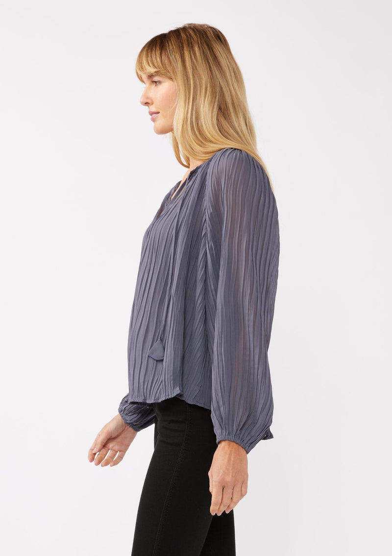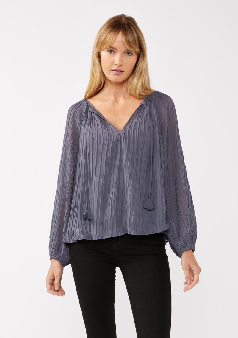 A relaxed bohemian blouse featuring an effortless pleated design.