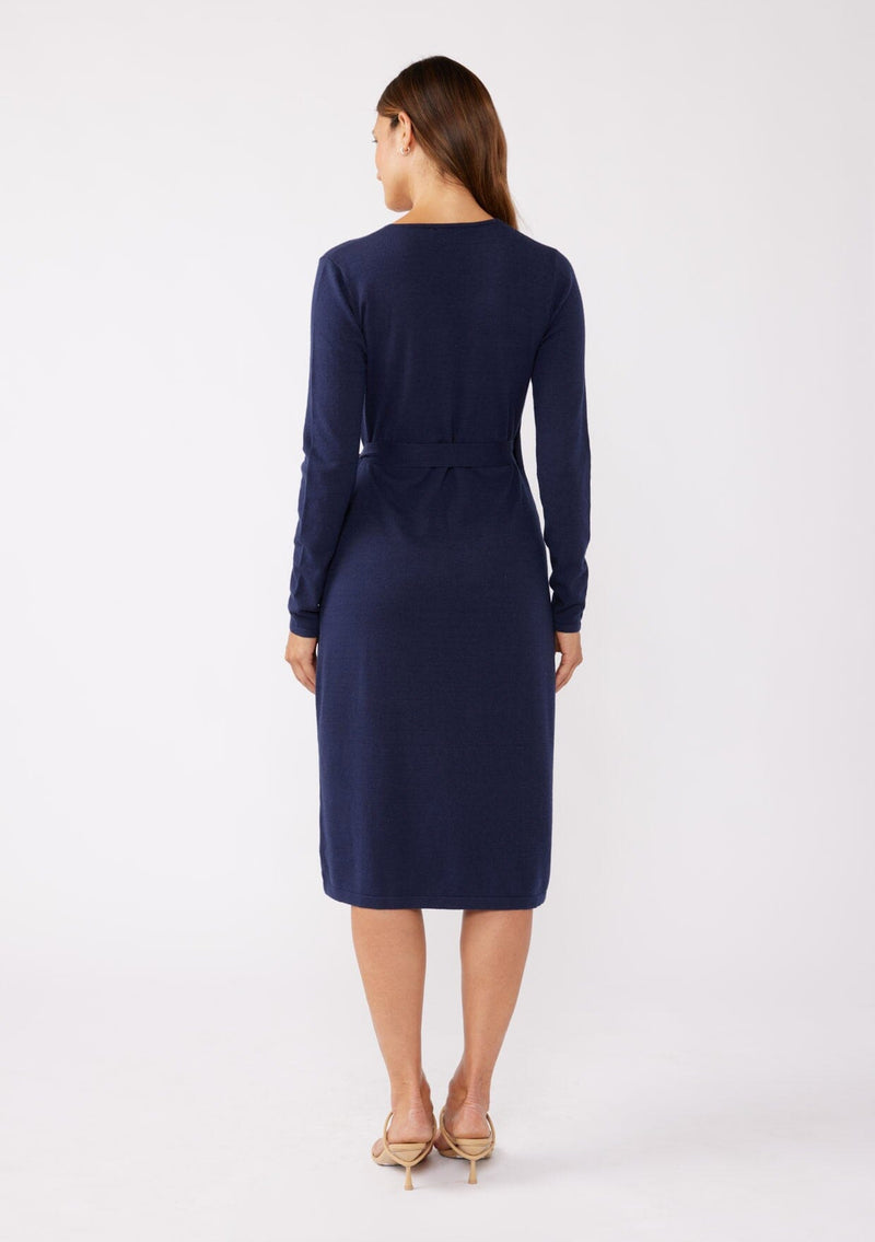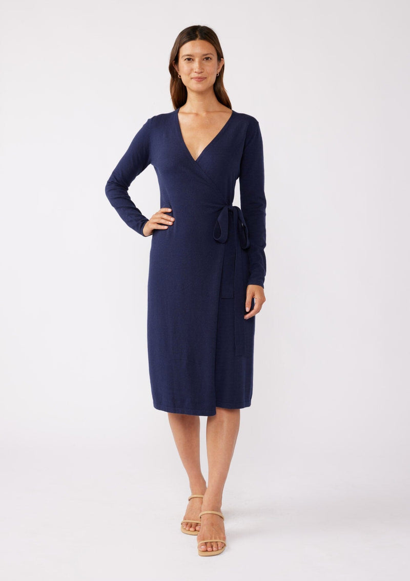 A long-sleeve midi wrap dress in a cozy navy blue knit.