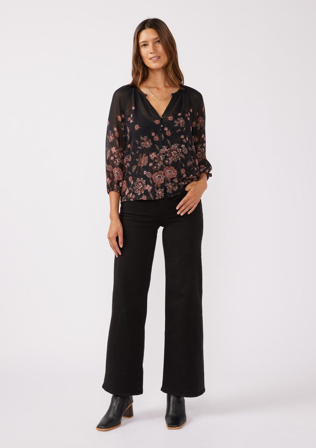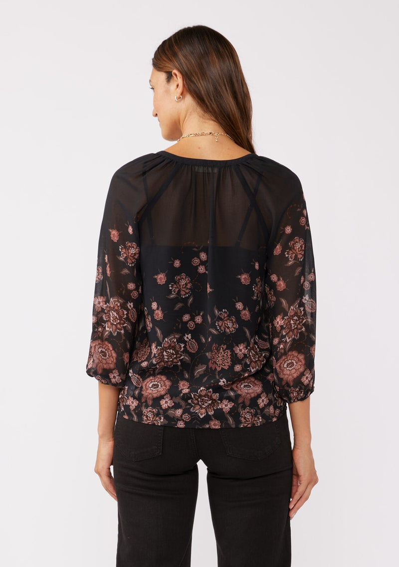 Elevate your holiday wardrobe with our floral sheer chiffon blouse, designed to bring a touch of bohemian charm. This blouse features a relaxed silhouette with a self-covered button front, a split v-neckline, and 3/4 length sleeves. We love pairing this blouse with delicate gold-tone jewelry to add a festive touch, making it perfect for any celebration.
