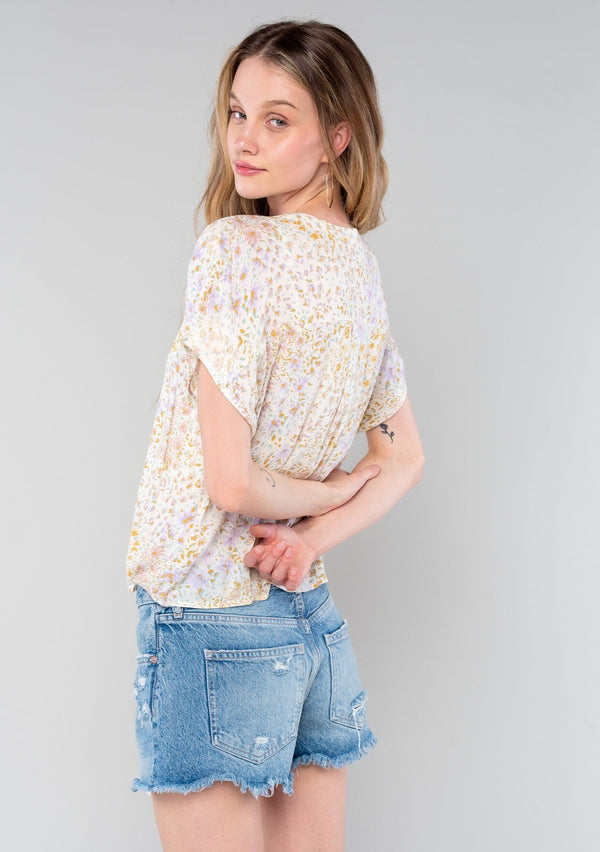 [Color: Ivory/Sky] A blond model wearing a short sleeve top in a floral print. With a cuffed dolman sleeve, a split v neckline, and an easy popover style silhouette. [Color: Ivory/Sky] A blond model wearing a short sleeve top in a floral print. With a cuffed dolman sleeve, a split v neckline, and an easy popover style silhouette.
