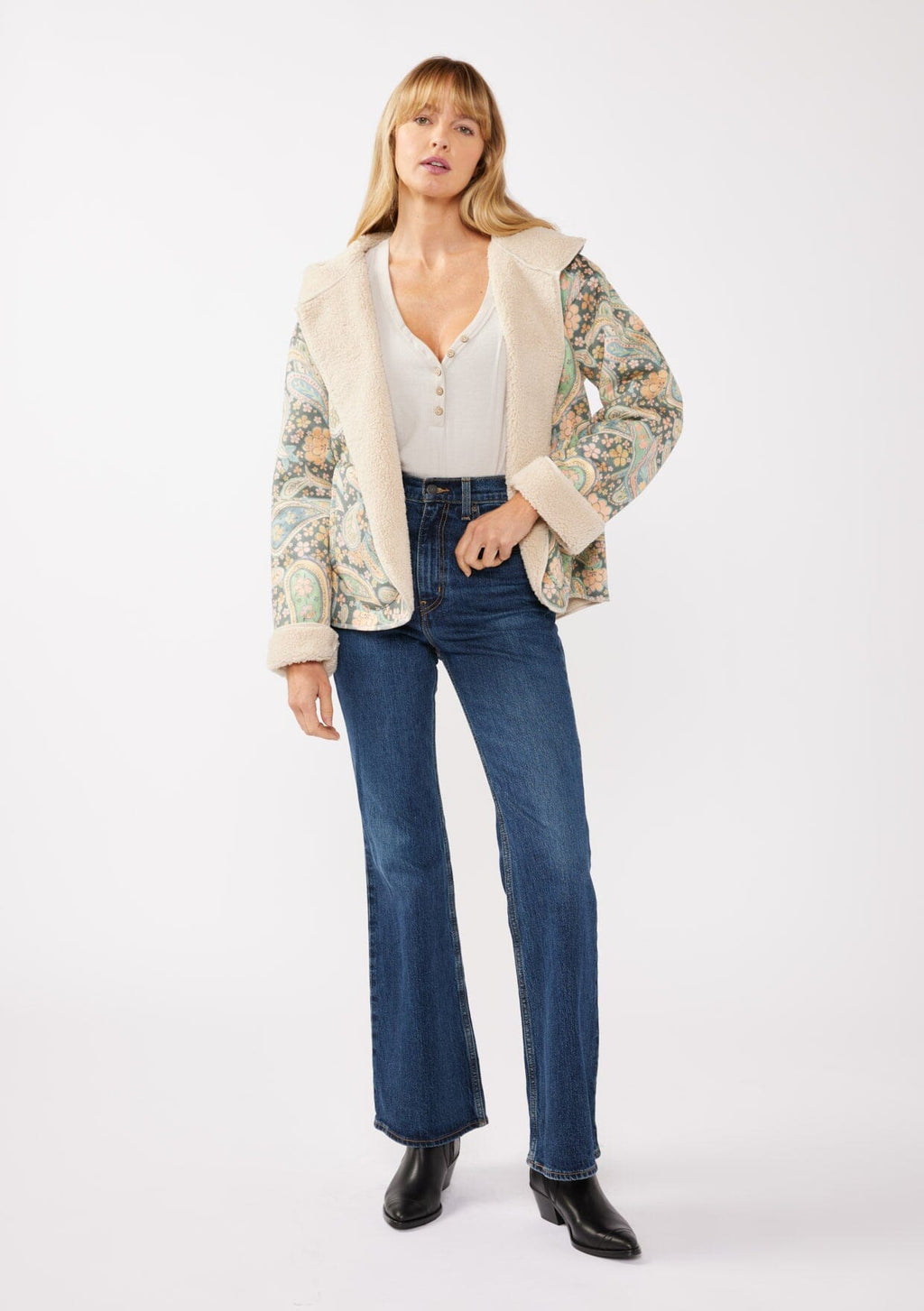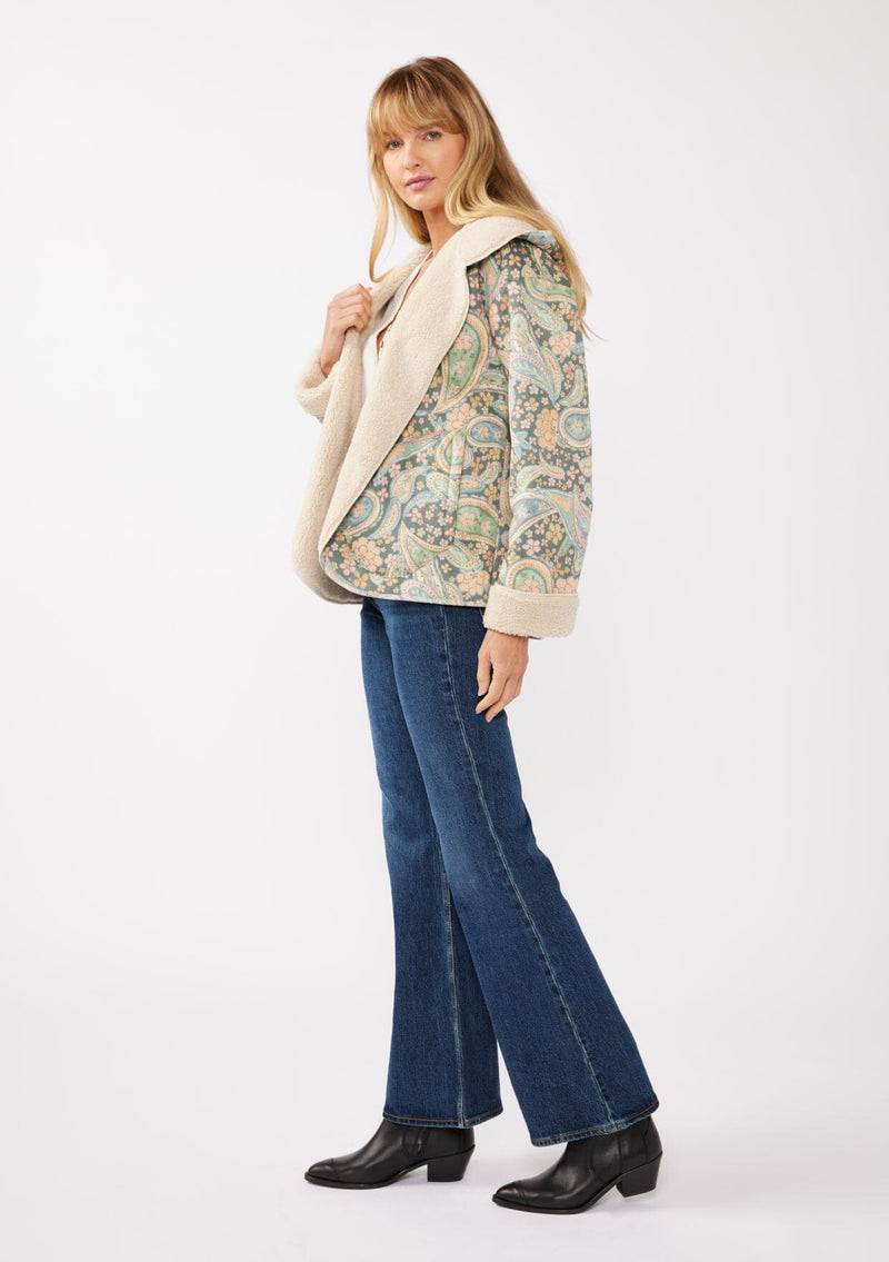 A fun statement jacket in a paisley, floral print with faux shearling lining.
