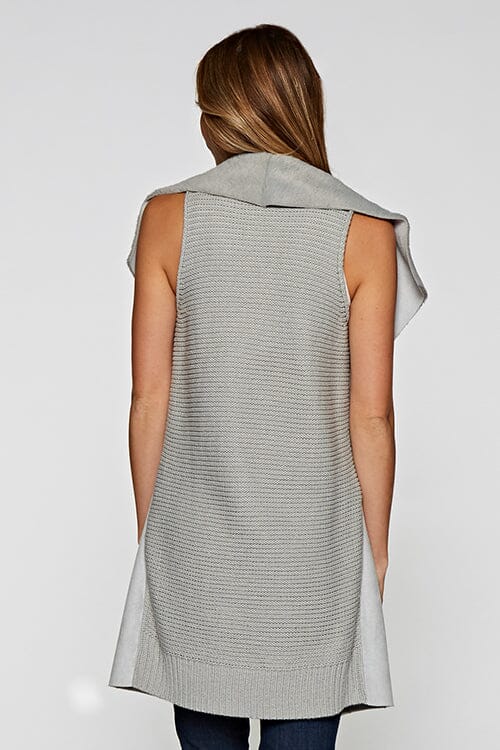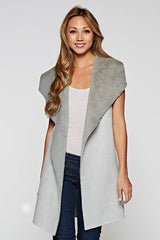 Slip into this sleeveless vegan suede vest and feel the cozy embrace of its soft faux fur shawl collar. The ribbed sweater knit back adds a touch of texture, making it the perfect piece for layering over your favorite fall essentials. Whether you're layering up for extra warmth or adding a casual, throw-on touch to your outfit, this versatile vest has you covered.