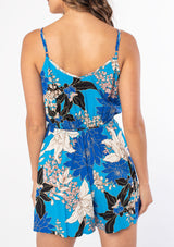 A casual bohemian sleeveless short romper in a bright blue floral print.